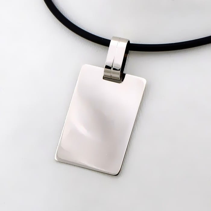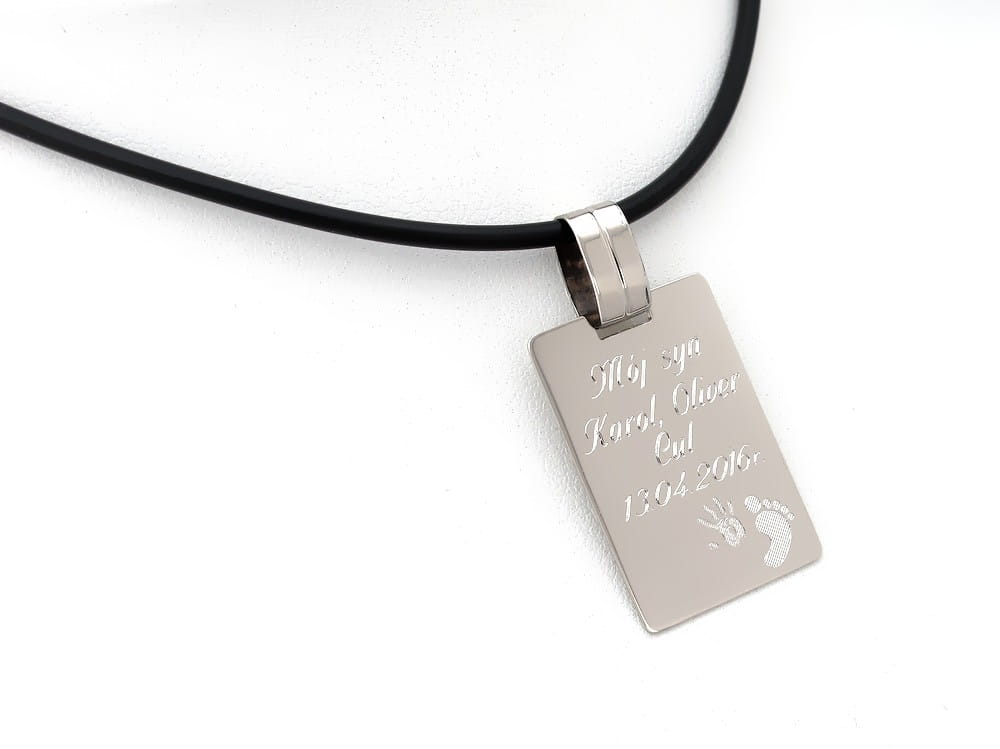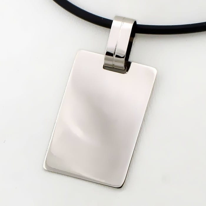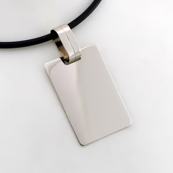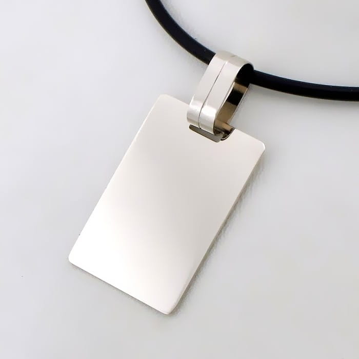 Zawieszka dla mężczyzny wykonana z białego złota złota pr. 585 w naturalnym kolorze. Klasyczny, prostokątny kształt możemy ozdobić grawerowanymi narożnikami lub ramką. Duża, prosotkątna przelotka na łańcuszek posiada pionowe ozdobne nacięcie. Zawieszka wykonana została w naszej pracowni i jest cechowana w urzędzie probierczym. Białe złoto, z którego wykonaliśmy tą zawieszkę jest twardsze od złota żółtego, co w połączeniu z solidną budową gwarantuje jeszcze większą trwałość i odporność na przecieranie w trakcie wielu lat noszenia zawieszki. Złota blaszaka posiada gładkie, polerowane wykończenie, a przelotka jest bardzo duża, że spokojnie pozwoli na zawieszenie na każdym złotym łańcuszku nawet o grubym splocie. (przykładowy kauczukowy naszyjnik widoczny na zdjęciach ma średnicę 2 mm)