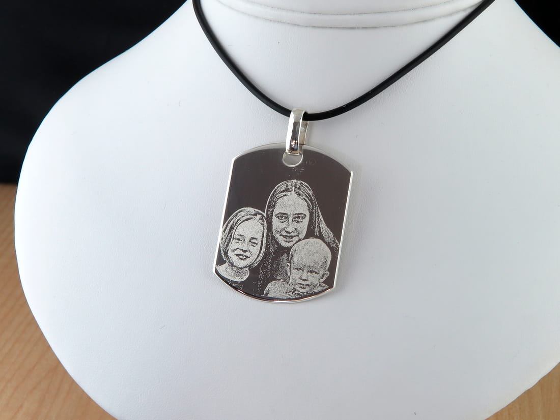 Jest to dość sporych rozmiarów nieśmiertelnik, z grubego sztywnego arkusza srebra (1mm). Obie jego strony nadają się pod grawerunek. Powierzchnia może zostać wykończona na połysk lub mat wedle życzenia. Wielkość przelotki na łańcuszek dopasujemy wg potrzeby do każdego splotu łańcuszka. Wystarczy podać wymiary przekroju splotu. Podobnie kształt samego nieśmiertelnika możemy dopasować do Państwa oczekiwań. Może być bardziej podłużny, bardziej prostokątny, ze ściętymi narożnikami itp. Wszystko jest do ustalenie poprzez email, wystarczy przesłać zapytanie. Na projekcie do oceny możemy także umieścić podgląd grawerunku.