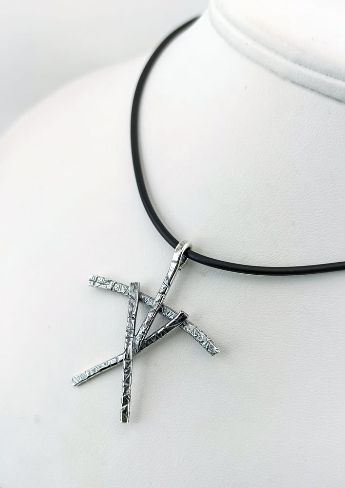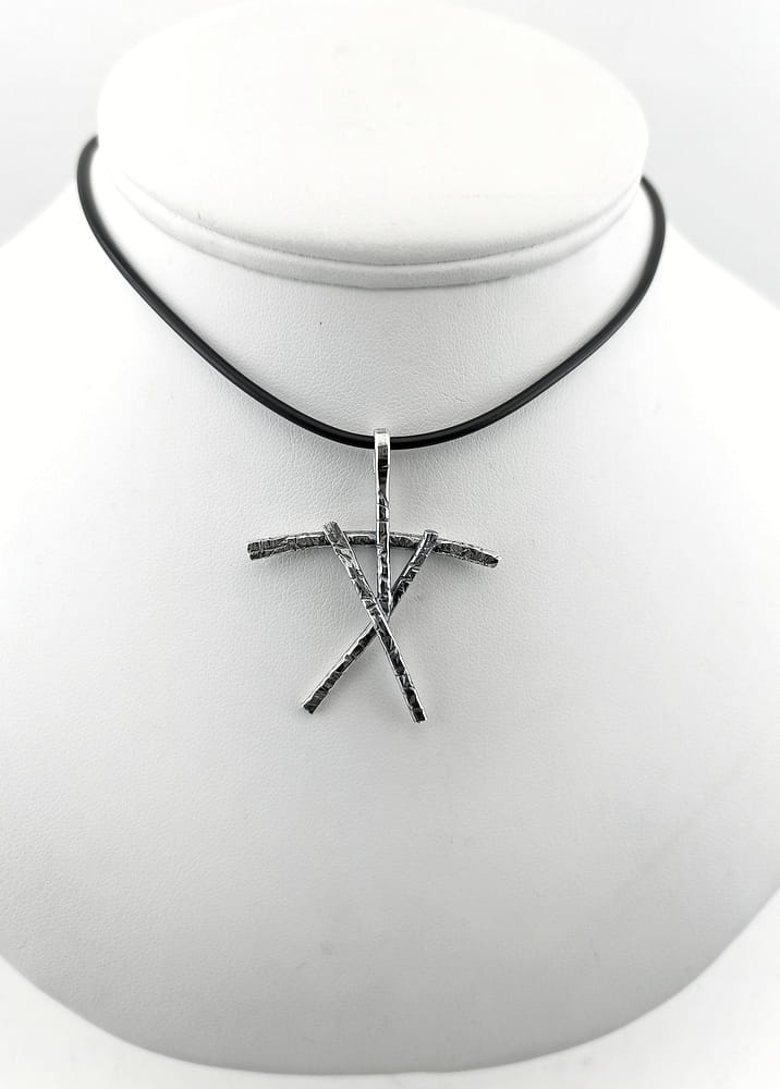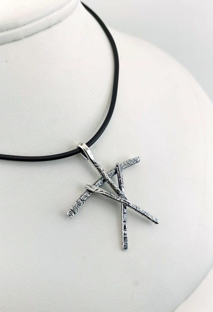 Pomysł na taką zawieszkę podsunęła nam pewna klientka. Przesłałą zdjęcie podobnej zawieszki wykonanej ze srebra. Szukała takiego właśnie wisiorka, w rozmiarze około 4 - 5 cm. Rozpoznaliśmy wzór krzyżyka z filmu Blair Witch Project więc było oczywiste, że całość ma przypominać formę człowieka złożonego z kilku gałęzi. Dobraliśmy srebrny drut o średnicy 2 - 2,5 i odpowiednio ukształtowaliśmy, a przez młoteczkowanie, piłowanie i frezowanie nanieśliśmy fakturę podobną do drewana. Po ułożeniu stosu zlutowaliśmy poszególne elementy. Miejsce na łańcuszek lub naszyjnik umieszczone jest z tyłu zawieszki, w zawinijętym oczku z jednej z gałęzi. Wymiary wykonanej zawieszki to około 4x4 cm. Całość ze srebra 925. Z uwagi na całkowicie ręczne wykonanie , każda zawieszka ma indywidualny i niepowtarzalny wygląd.