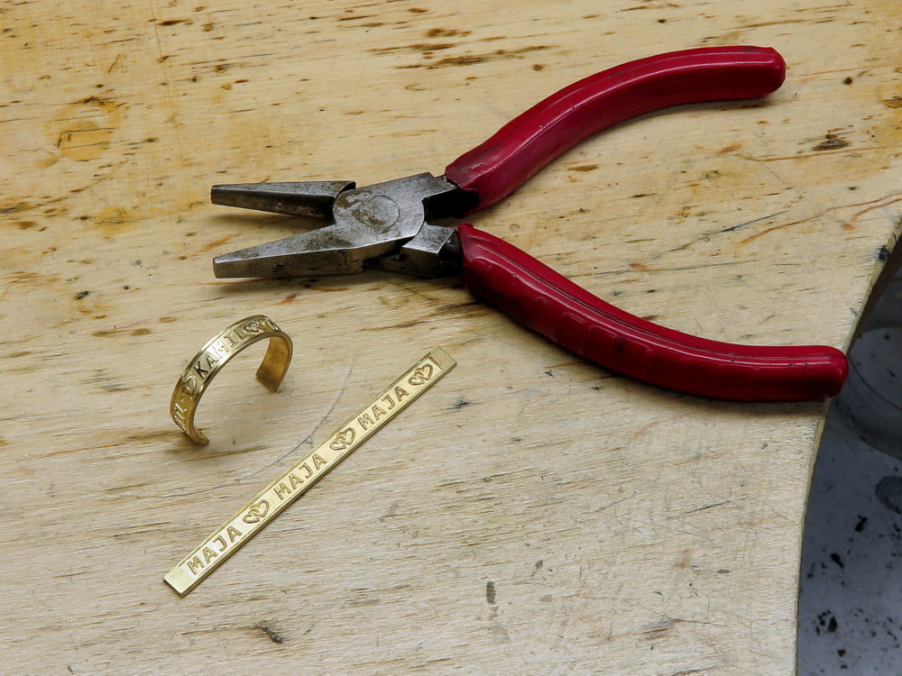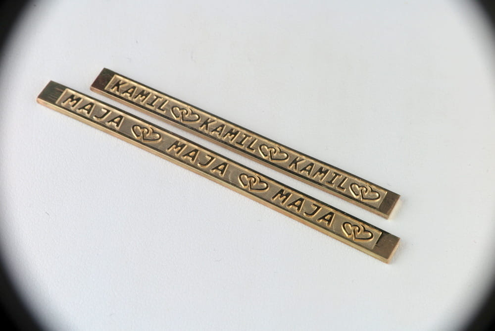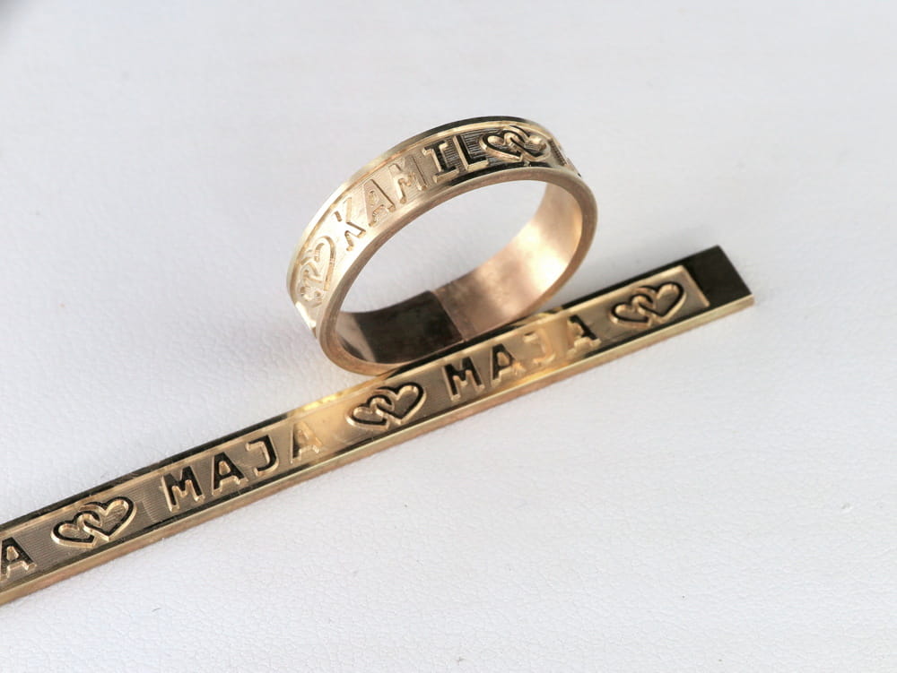 Złote obrączki ślubne wykonane z żółtego złota pr. 585. Płaskie, szerokości około 5mm, zdobione z wierzchu głębokim i wypukłym grawerunkiem imion i serduszek. Całość wykonana i zaprojekowana według pomysłu klienta. Przed wykonaniem grawerunku wykonaliśmy do oceny próbkę napisu w skali 1:1 w laminacie. Obrączka posiada na obwodzie zapas miejsca do wykonania ewentualnej korekty rozmiaru w przyszłości. Usługę taką możemy wykonać również w naszej pracowni.