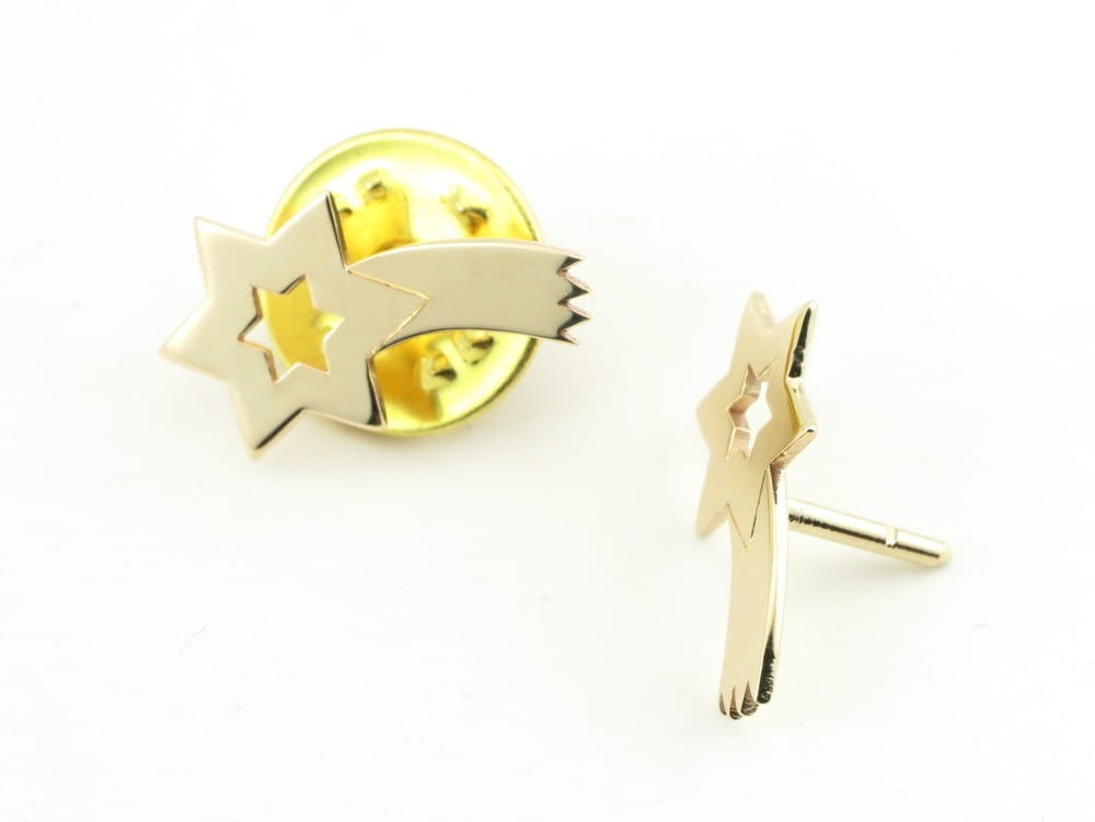 Złoty pin do marynarki w kształcie Gwiazdy betlejemskiej został wykonany na zamówienie klienta, a inspiracją była wykonana przez nas broszka o podobnej tematyce. Dopasowaliśmy odpowiednio wzór, skracając nieco ogonek, by dopasować go do oczekiwanej wielkości. Gwiazda wykonana jest z żółtego złota próby 585 (grubość arkusza to 0,80mm), jedynie zapinka trzymającą pin pod klapą marynarki wykonana jest z mosiądzu i sprężynka w środku pozwala na solidne trzymanie biżuterii. Kształt i wielkość ustalamy poprzez projekt przed wykonaniem. Jeśli szukają Państwo podobnej biżuterii, prosimy o kontakt.