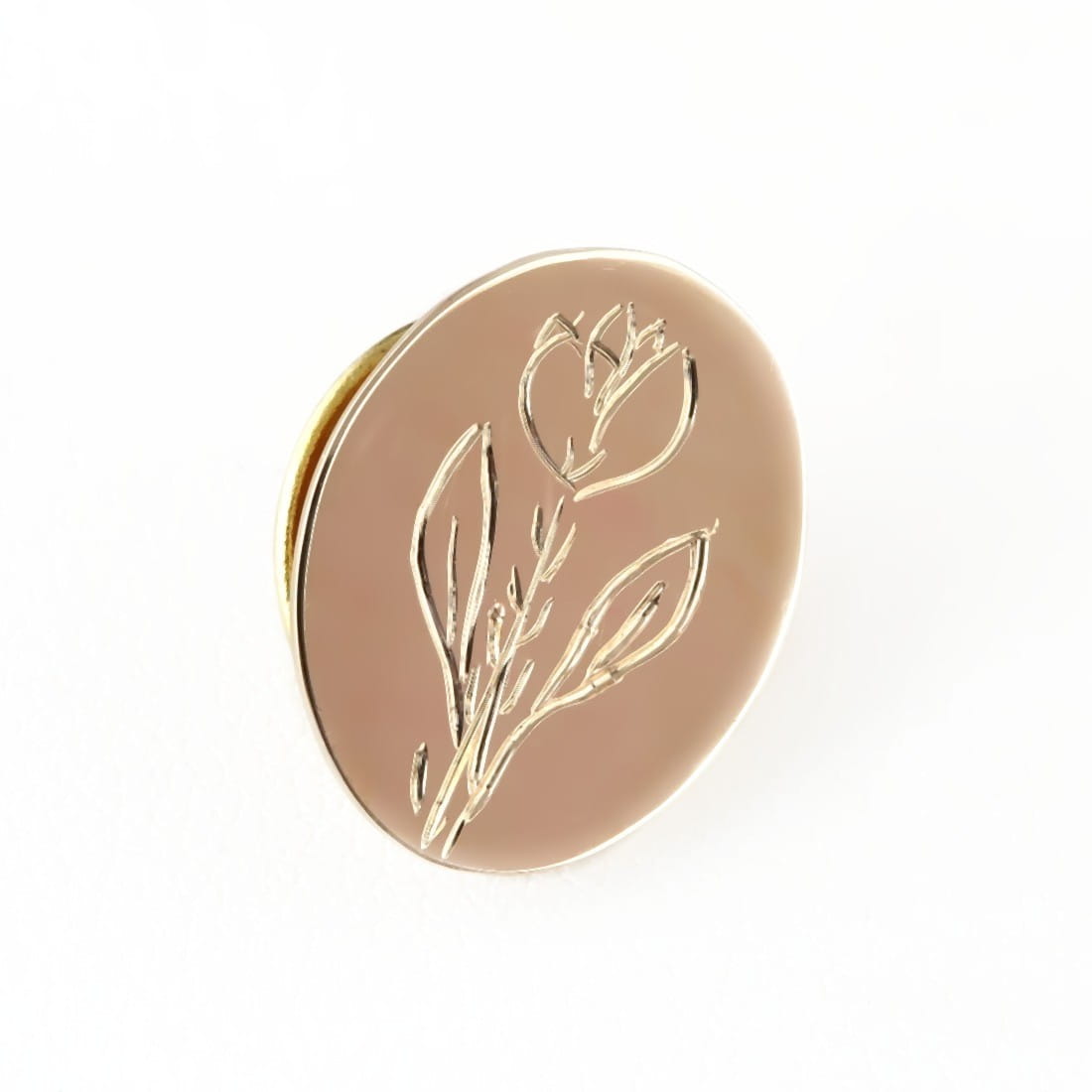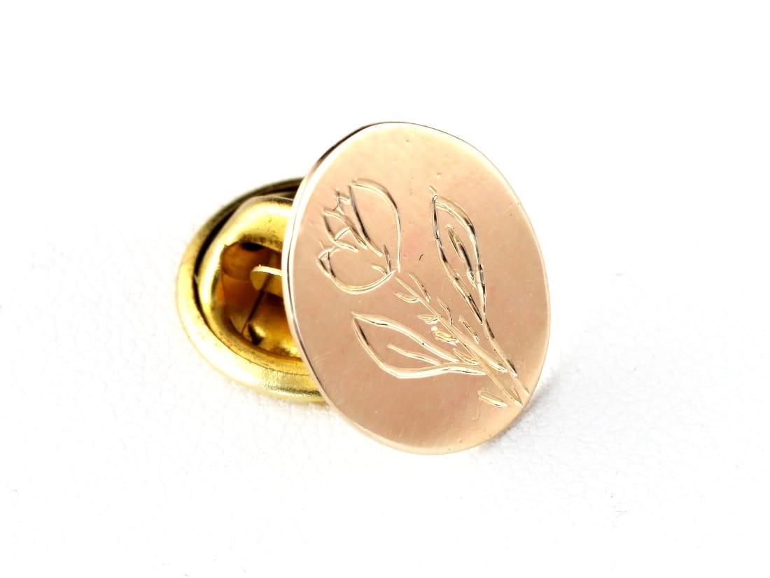 Złota przypinka do marynarki z motywem krokusa została zamówiona i wykonana na życzenie klienta. Owal ze złota próby 585 został zaopatrzony w odpowiednią szpilkę mocująca, pasującą do uniwersalnego zatrzasku, wypolerowany na wysoki połysk. Sam krokus został wygrawerowany ręcznie. Technika ta zapewnia unikalność wzoru, jego ogromną trwałość oraz świetną widoczność. Linie pozostawione przez sztychem grawerski są grube i błyszczące. Dodadkowym akcentem jest data grawerowana po wewnętrznej stronie spinki, która jest symboliczna dla klienta.