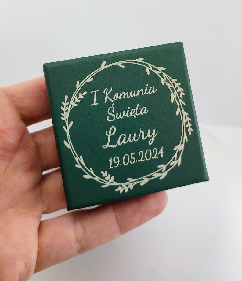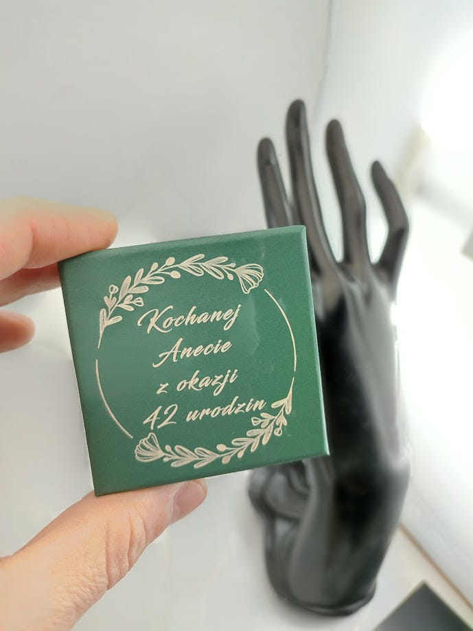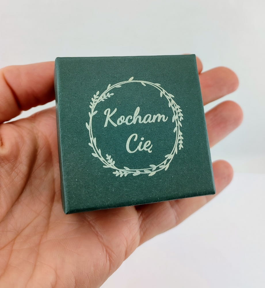 Od 2024 roku mamy możliwość grawerowania również na opakowaniach. Dlatego do oferty dołączyliśmy takie właśnie opakowanie na sprzedawaną biżuterię. Kartonowe pudełko z kolorze zielonym z uniwarsalną wkładką ma zamocowania zawieszki, kolczyków, pierścionka, obrączki czy też naszyjnika. Wieczko w tym modelu pudełka znakomicie nadaje się na personalizację. Grawerunek dedykacji , życzeń, cytatów, symboli , dat i motywów tematycznych zrobi na obdarowywanej osobie to dodatkowe, wyjątkowe wrażenie. Często takie pudełko staje się miłą pamiątką, ponieważ są wyjątkowe i łątwo budzą miłe wspomnienia.