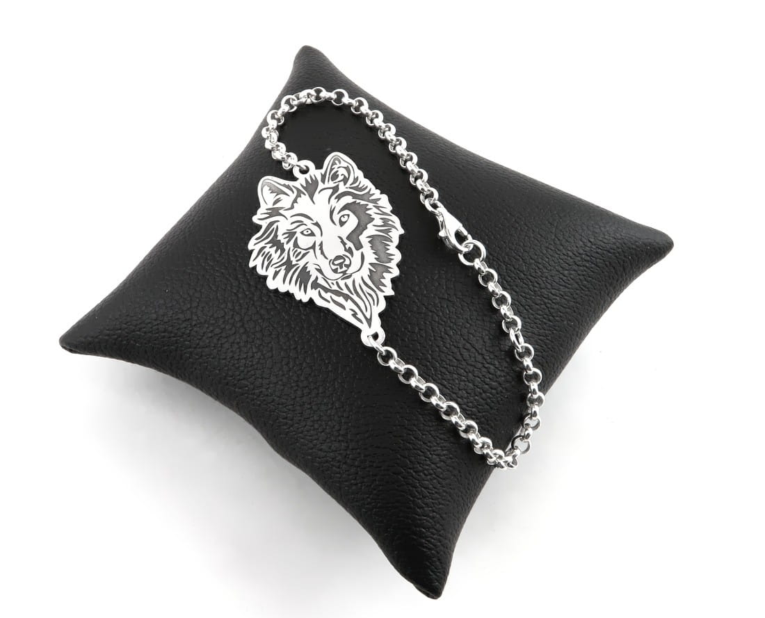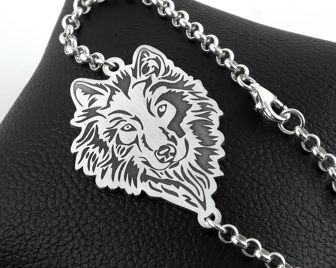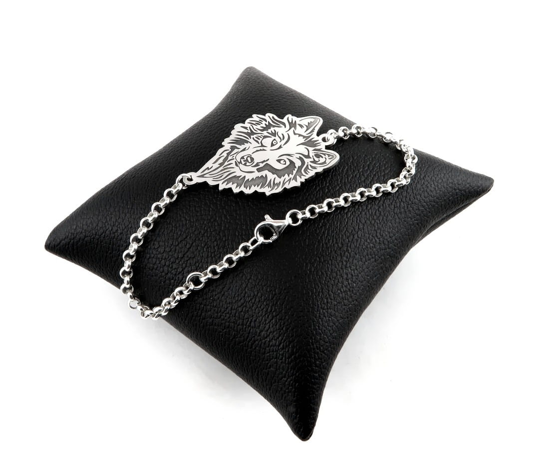 Wilki stały się ostatnio jednym z popularniejszych motywów, jakie wykonujemy. Na życzenie klientki przygotowaliśmy srebrną bransoletę z głową wilka. Z arkusza w próbie 925 wycięliśmy odpowiedniej wielkości kształt, na który został naniesiony szczegółowy grawerunek. Wklęsłe miejsca zostały zaczernione oksydą, plecy i brzegi zostały wypolerowane na wysoki połysk, natomiast front wykończony został satyną. Bransoleta zamocowana została na łańcuszku w splocie rolo i dopasowana długością do nadgarstka właścicielki. Świetnie wygląda w komplecie z naszymi srebrnymi kolczykami.