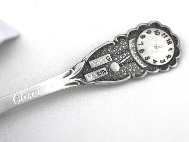 Srebrna łyżeczka z możliwością grawerunku jest idealnym prezentem na chrzest lub z okazji narodzin dziecka. Na zegarze umieszczonym na trzonku nanosimy datę, godzinę oraz długość i wagę noworodka. Po przeciwnej stronie można wygrawerować dedykację. Łyżeczka ma długość 13 cm i wykonana jest ze srebra próby 925, co zapewnia jej trwałość i wytrzymałość. Masa wynosi około 24 - 25 gram.
