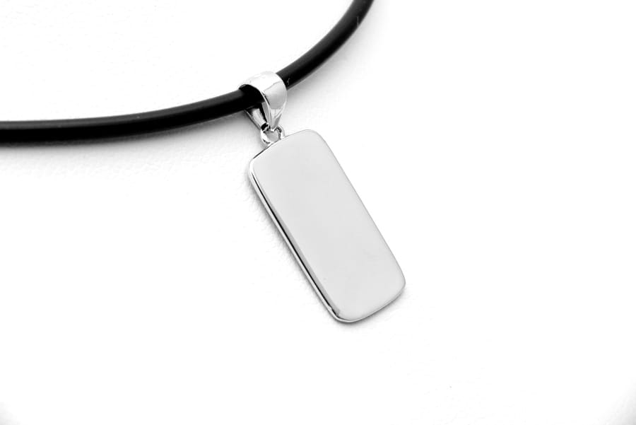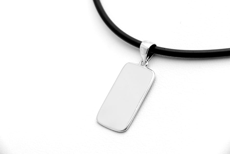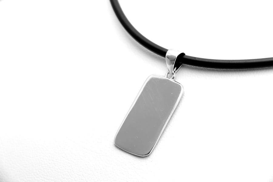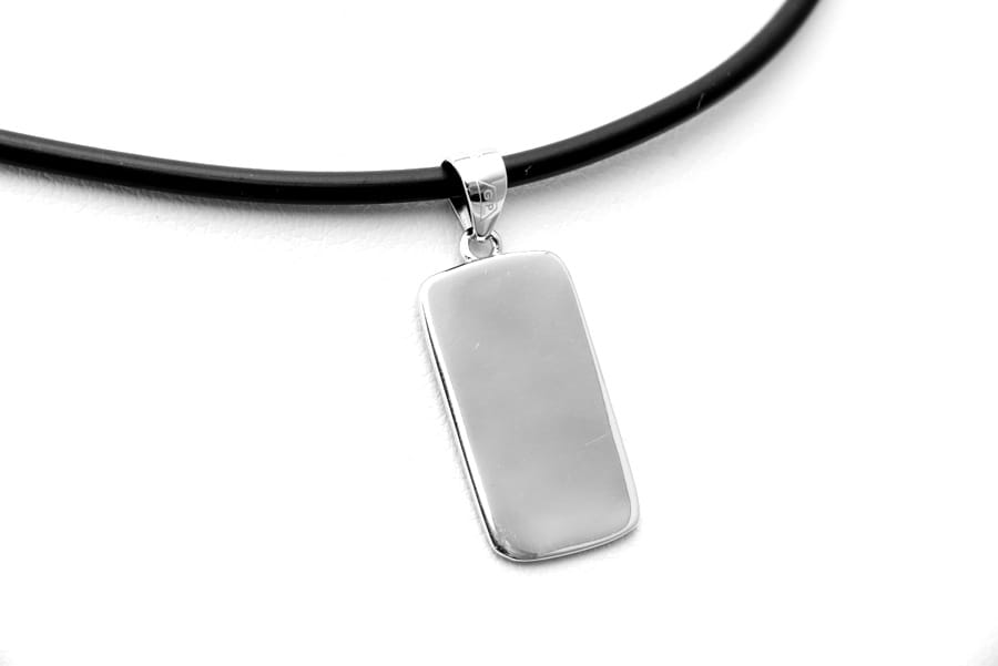 Przywieszka na łańcuszek w kształcie prostokąta z zaokrąglonymi bokami, wykonana ze srebra próby 925. Duże uszko pozwala na dopasowanie nawet do łańcuszków o grubym splocie.