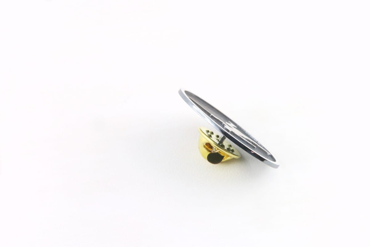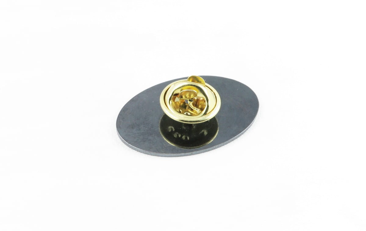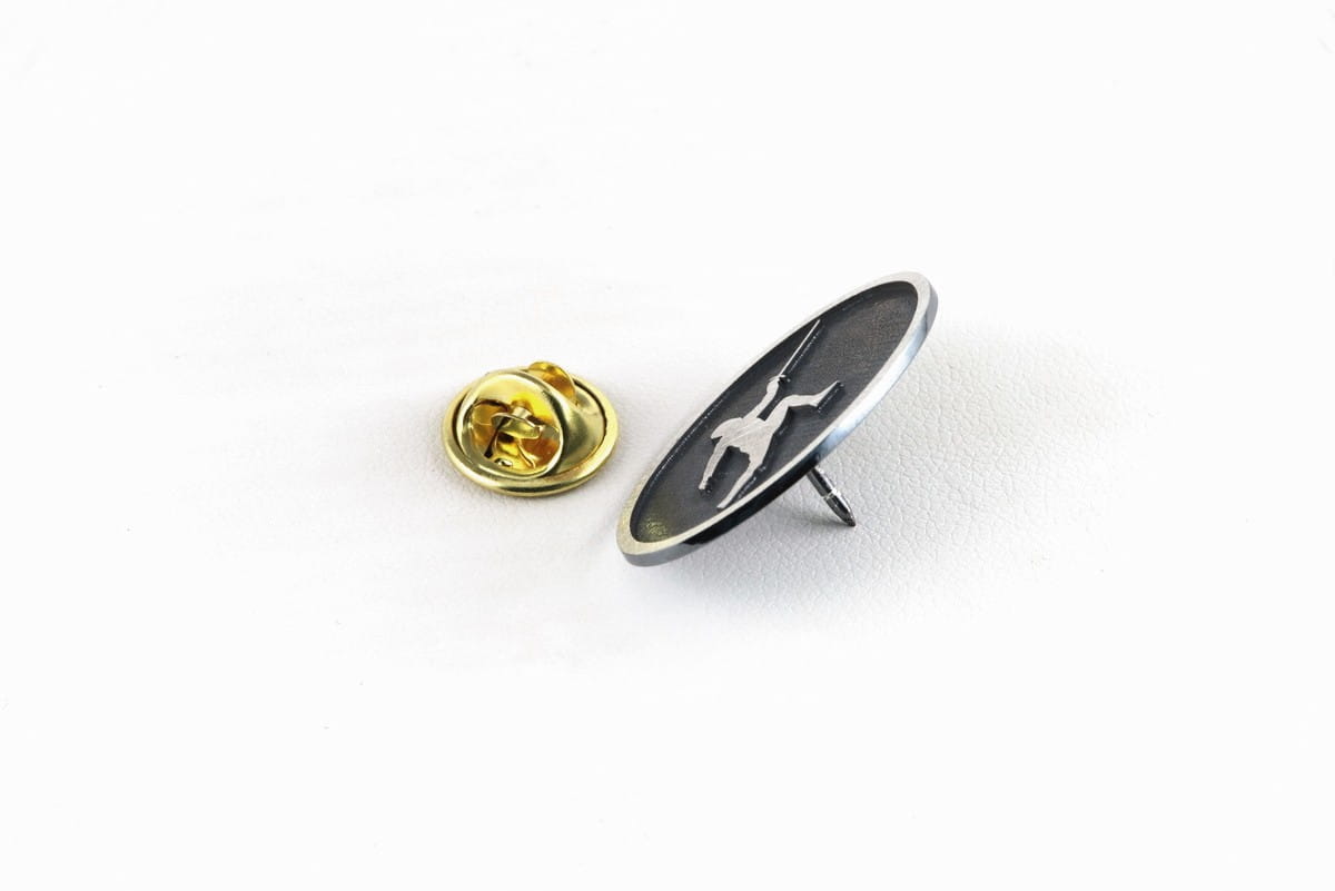 Na życzenie klienta wykonaliśmy srebrną przypinkę do marynarki z postacią szermierza. Po ustaleniu szczegółów z klientem przystąpiliśmy do pracy. Ze srebrnego materiału w próbie 925 wycięliśmy okrąg o wymiarach 20 × 30 mm. Na okręgu wygrawerowaliśmy na wyskok postać szermierza i zostawiliśmy ozdobną ramkę, natomiast tło zostało zaciemnione oksydą, by uwypuklić, postać na przypince. Z tyłu zamontowaliśmy szpilkę i opatrzyliśmy mosiężnym klipsem. Przypinka została wykończona diamentową sciernicą.