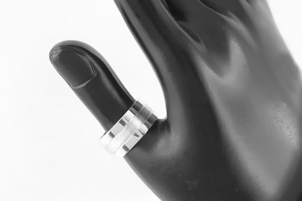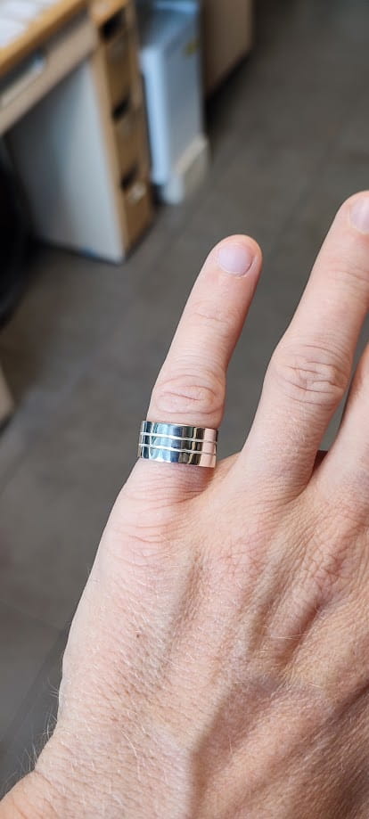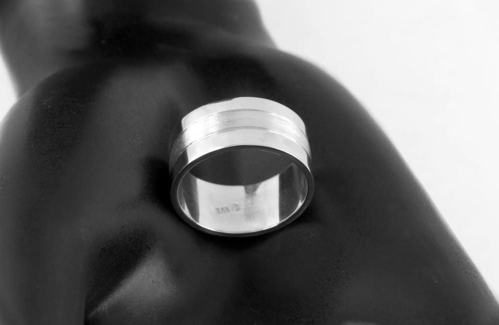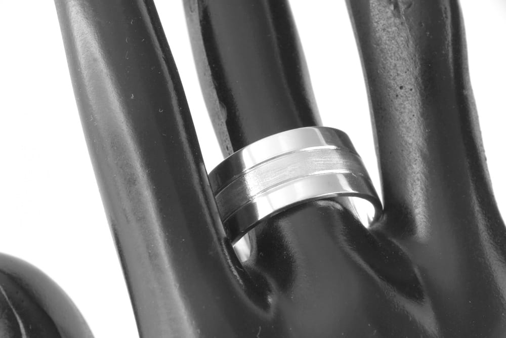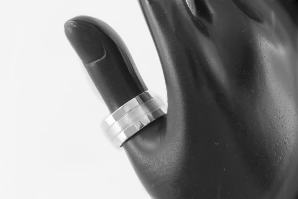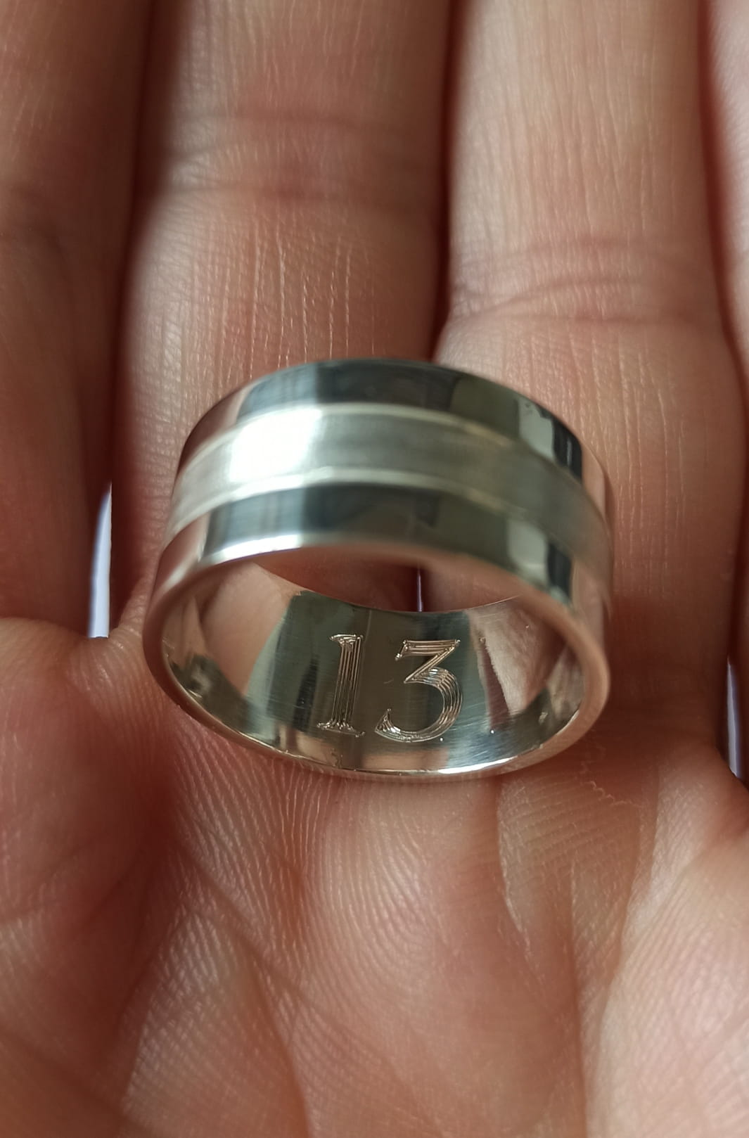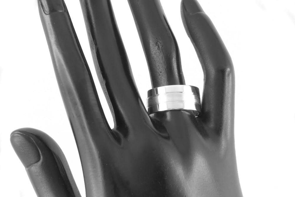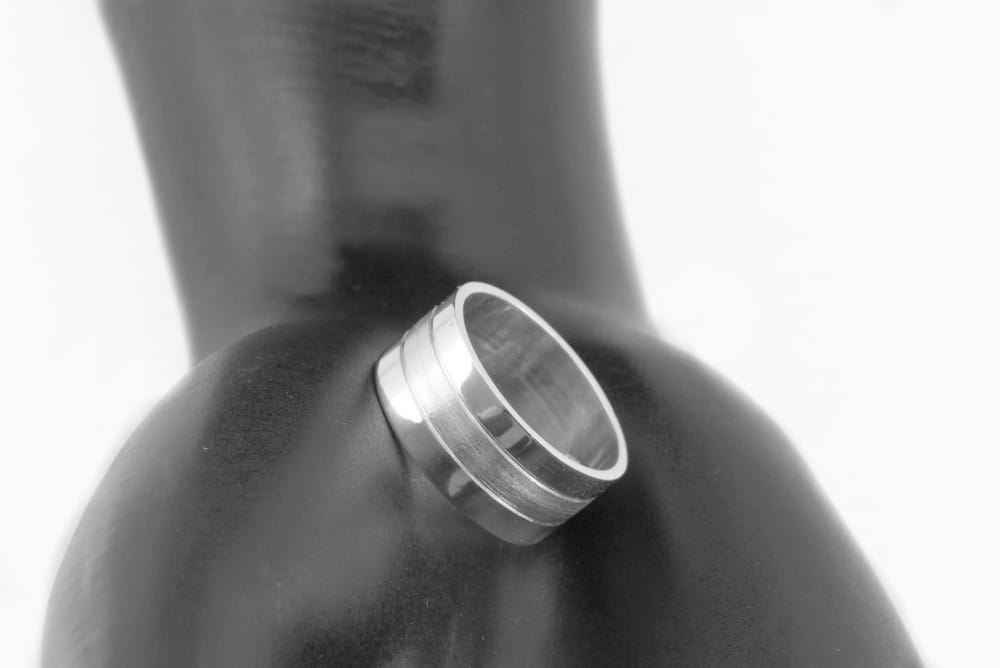 Taki model obrączki zamówił kiedyś u nas klient. Szukał szerokiej obrączki z jasnem paseczkiem po środku. Zaprojektowaliśmy zatem srebrną, szeroka na 1 cm obrączkę z matowym paskiem zdłuż obowodu. Sam pasek oddzielony jest głębszymi nacięciami. Rozmiar obrączki ustalamy indywidualnie. Wewnątrz obrączki możemy wykonać błyszczący grawerunek. Możemy także wykonać podobną obrączkę z innym wzorem na zewnątrz i w innej szerokości. Osoby zainteresowane prosimy o kontakt mailowy.