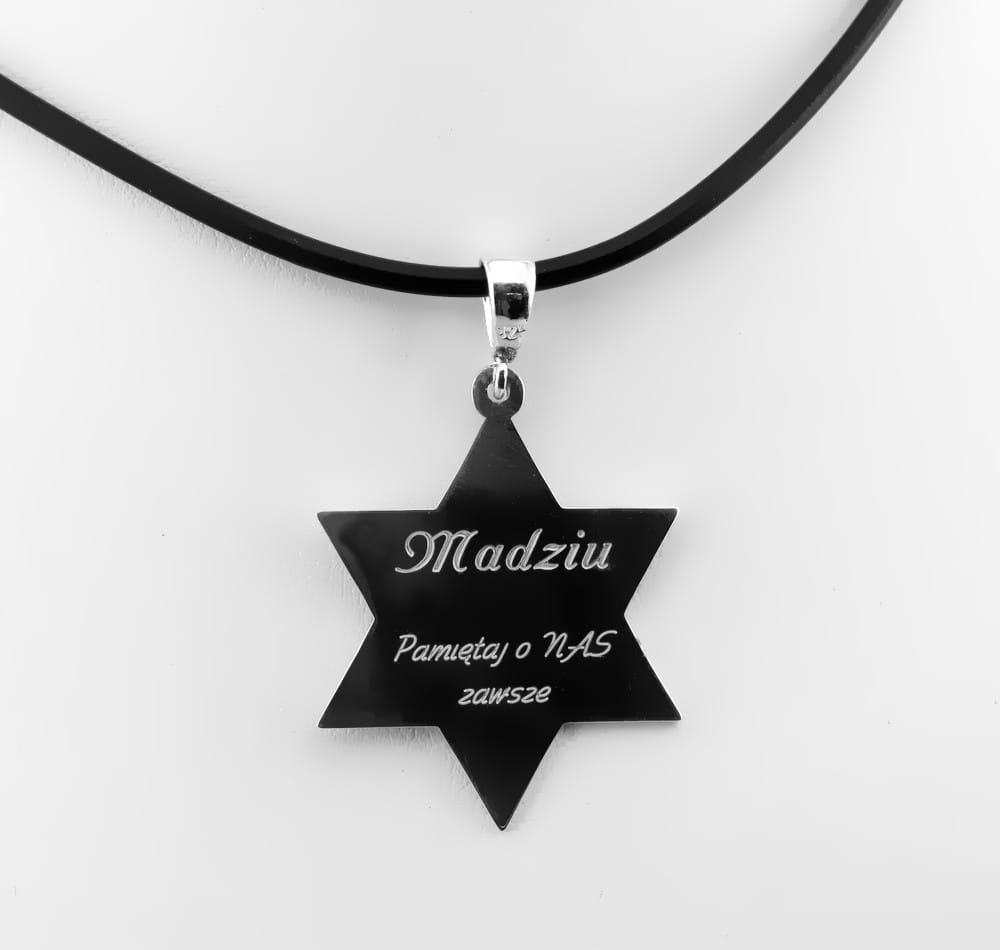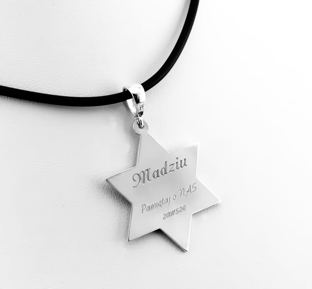 Srebrna zawieszka wykonana wg pomysłu i wzoru klienta. Wielkość gwiazdy to 25 x 25mm. Całość wykonana jest ze srebra pr. 925. Głebsze, grawerowane fragmenty zawieszki zostały zaczernione oksydą. Przed wykonaniem wysłaliśmy projekt w skali 1:1 do oceny. Przód wykończony jest na matowo a tył jest wypolerowany.