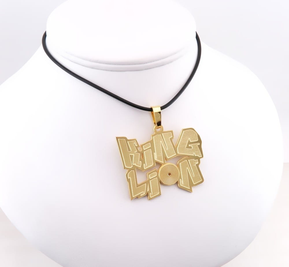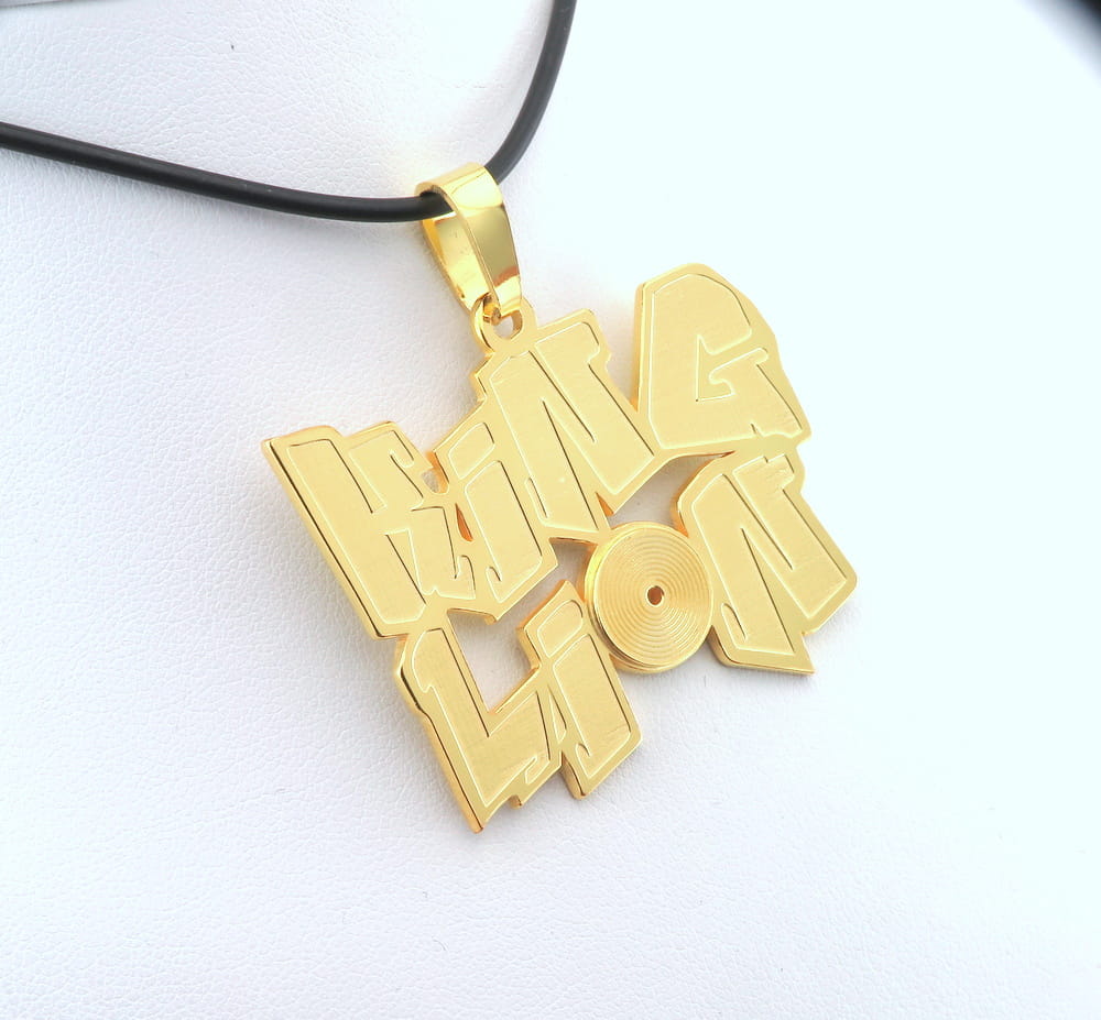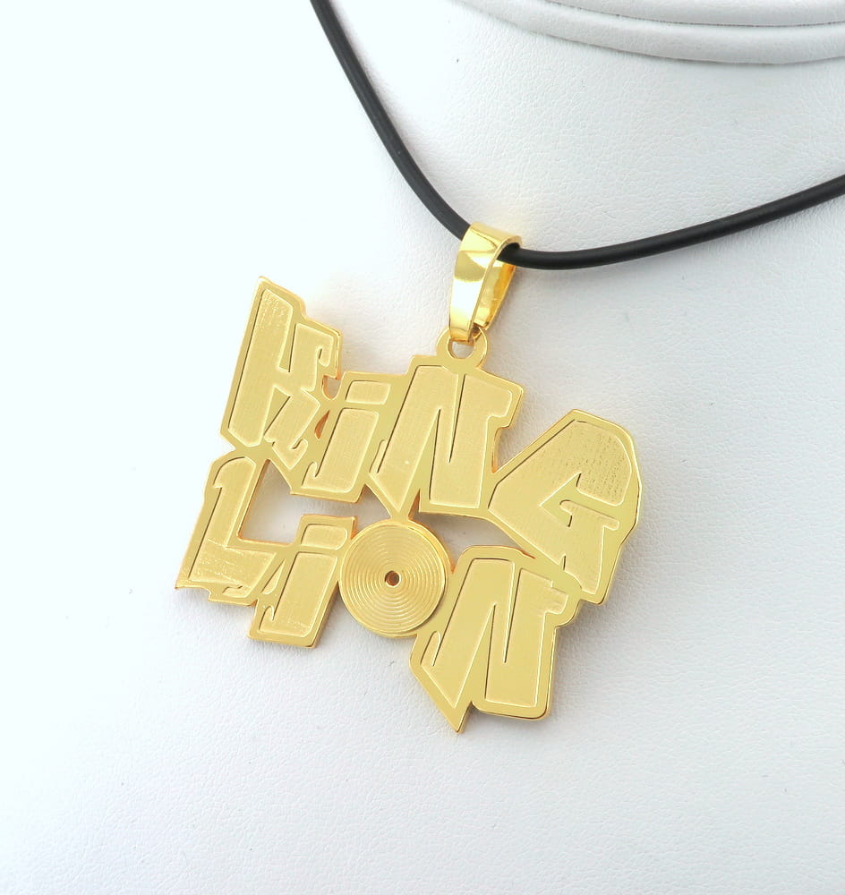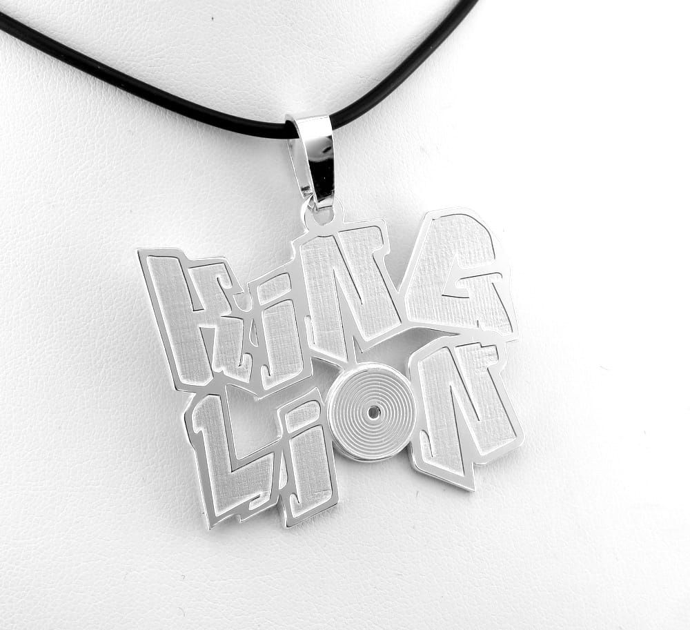 Duża zawieszka sylizowana na mural. Klientka szukała czegoś na prezent dla swojego syna. Zadzwoniła doa nas z zapytaniem czy możemy jej coś podpowiedzieć. Myślała o zawieszce z napisem LionKing a sposobała jej się forma podobnych zawieszek na naszej stronie. Całość miała być prezentem Napis zaprojektowaliśmy w wykorzystaniem czczionki zbliżonej do graffiti. Dodatkowo na literce O umieściliśmy małą gramofonową płytę, ze spiralnie wygrawerowaną ścieżką, co okazało się strzałem w dziesiątkę. Szerokość zawieszki ustaliliśmy na około 5 - 6 cm. Z arkusza srebra wycięliśmy zwieszkę o ustalonej wielkości, środek liter został wygrawerowany nieco głębiej, a na koniec całą zawieszkę pozłociliśmy.