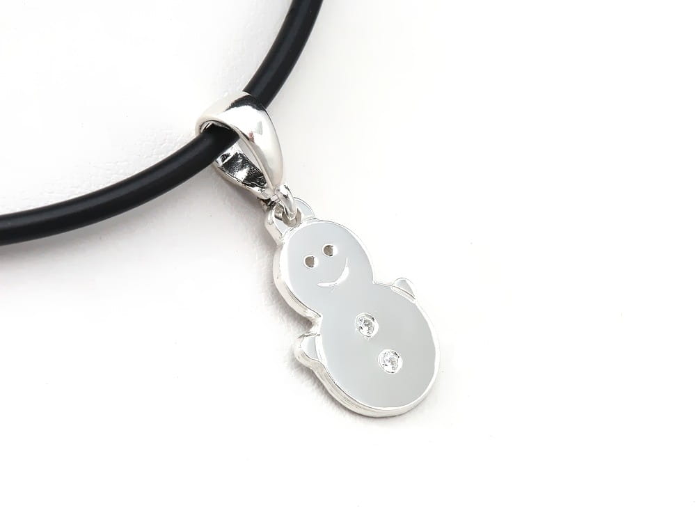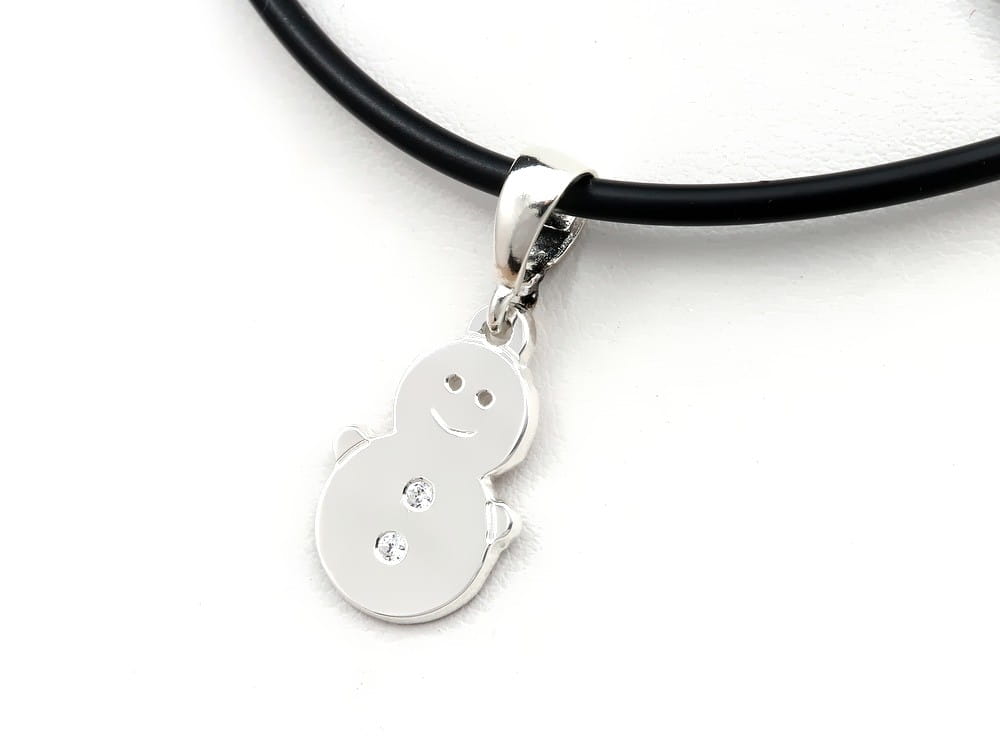 Prezentujemy srebnrą zawieszkę w formie śniegowego bałwanka. Formę zawieszki ustaliliśmy wraz z klientem. Wykonanie wisioreka poprzedziło wysłanie projektu w skali 1:1. Oczka to otworki na wylot , uśmiech jest grawerowany i błyszczący, a dwa guziczki to oprawione cyrkonie 1,50mm. Wysokość samego bałwanka to 15mm. Kółeczka łączące są zlutowane dla większej trwałości. Całości kompletu dopełnił kauczukowy naszyjnik (dopasowany na 40cm) również dostępny w naszym sklepie. Jeśli interesuje Państwa podobna zawieszka ale w nieco innej wielkości / kształcie, prosimy o kontakt.