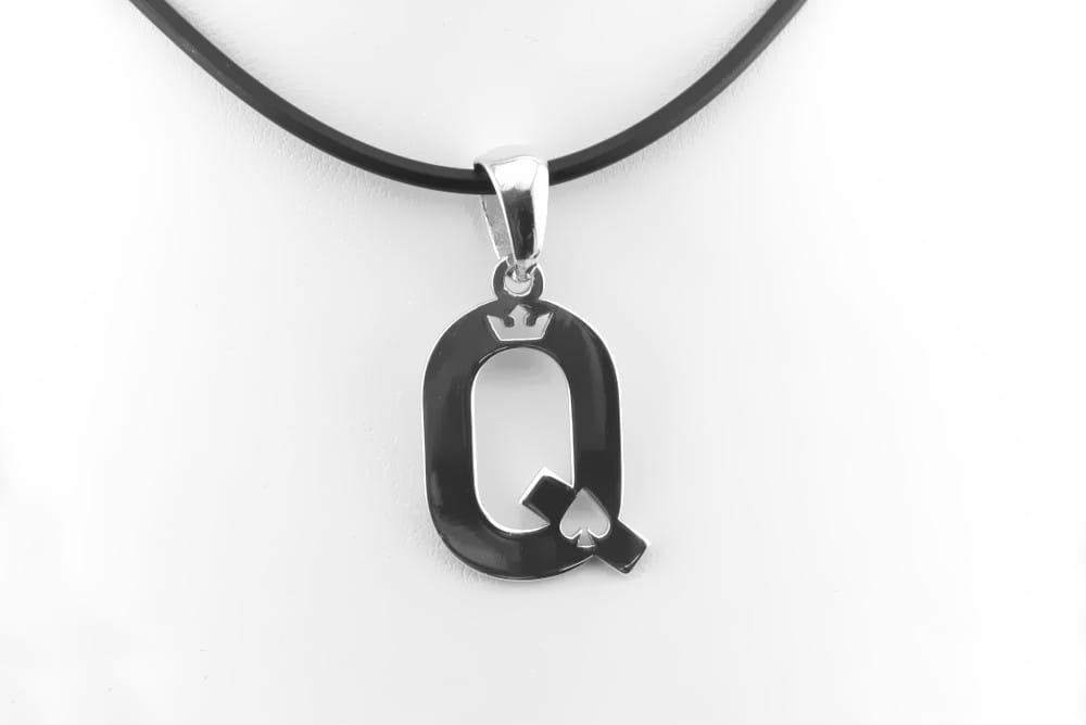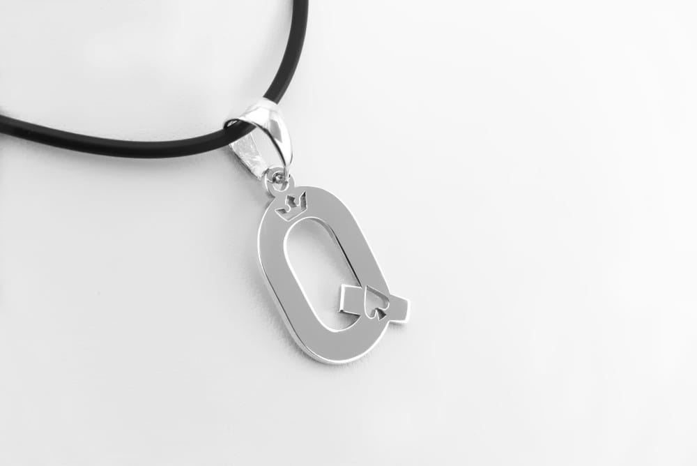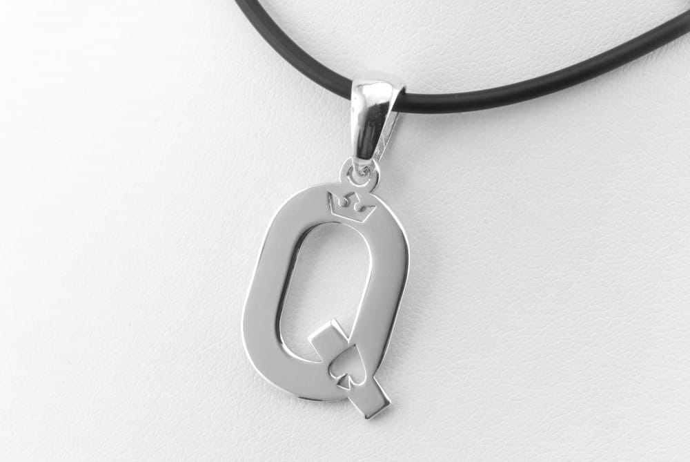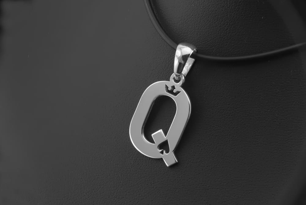 Ten bardzo ciekawy model wisiorka zleciła nam do wykonania nasza klientka. Przesłała mailowo swój rysunek i opis. Na tej podstawie przygotowaliśmy możliwy do wykonania projekt zawieszki. Odwzorowaliśmy kształt literki Q i przygotowaliśmy wzór korony do wycięcia na wylot. Całość wycięta została z grubszego arkusza srebra i wypolerowana. Forma zawieszki jest bardzo oryginalna, właśnie ze względu na ażurowe wykonanie. Te maleńkie otwory są wycięte bardzo precyzyjnie i są świetnie czytelne gołym okiem. Dodatkowo krawatka miała być dopasowana na szeroki srebrny łańcuszek. Efekt końcowy widać na zadjęciach produktu.