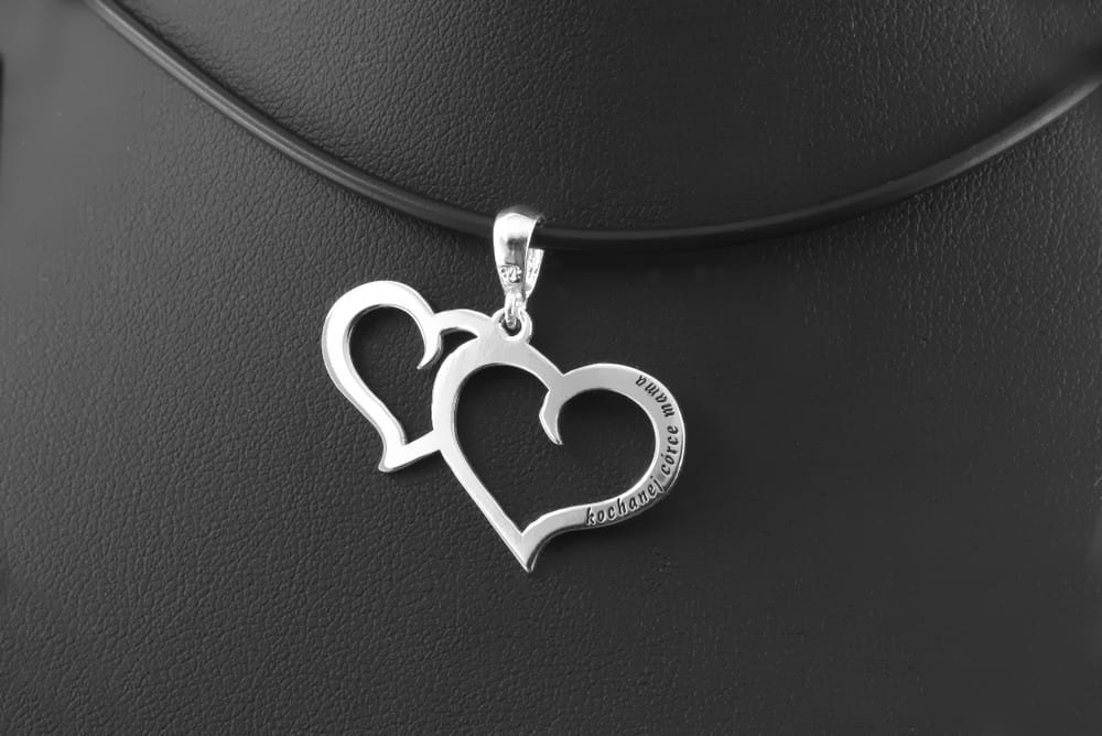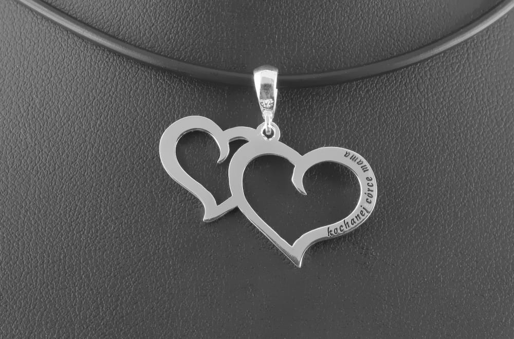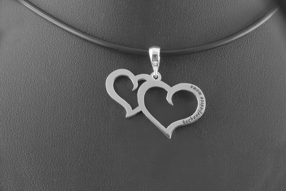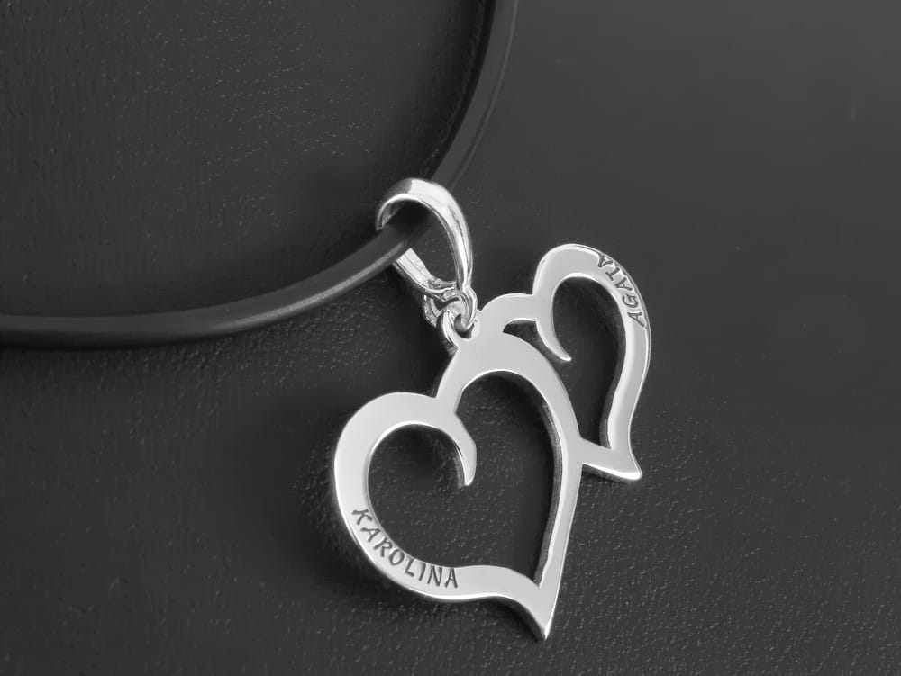 Klientka szukała zawieszki na prezent dla córki. Forma miała nawiązywać do serduszka. Aby calość wygladała bardziej orygnalnie niż popularne symetryczne serduszko, zaproponowaliśmy dwa połaczone ze zobą kontury serca. Taka forma wygląda nieszablonowo i przyciąga uwagę. Na obu stronach wykonaliśmy subtelny grawerunek napisów. Dedykacja została przyciemniona a powierzchnia serduszek wypolerowana. Całość jest wykonana ze srebra 925.