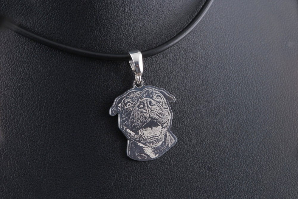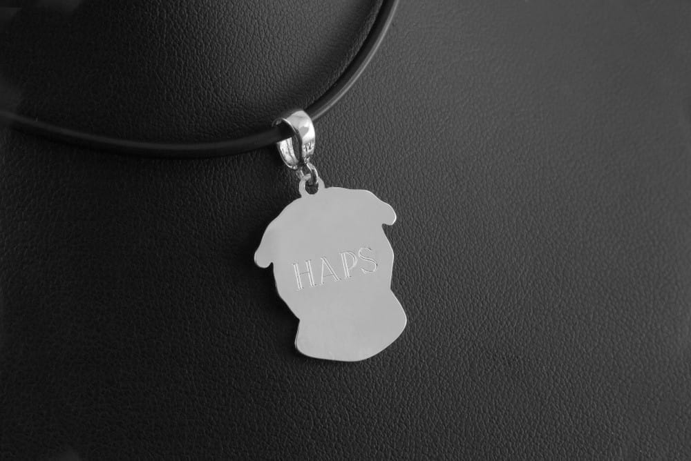Srebrna zawieszka z podobizną pupila. Zdjęcie do grawerunku przesłała klientka emailem. Na tej podstawie przygotowaliśmy projekt grawerunku i wysłaliśmy do oceny. Po wykonaniu wycięliśmy kontur i dołożyliśmy trójkątną krawatkę. Pani poprosiła również by na odwrocie wygrawerować czytelnie słowo HAPS. Napis jest wyraźny, błyszczacy. Wielkość zawieszki ustalona została wedle życzenia klientki.