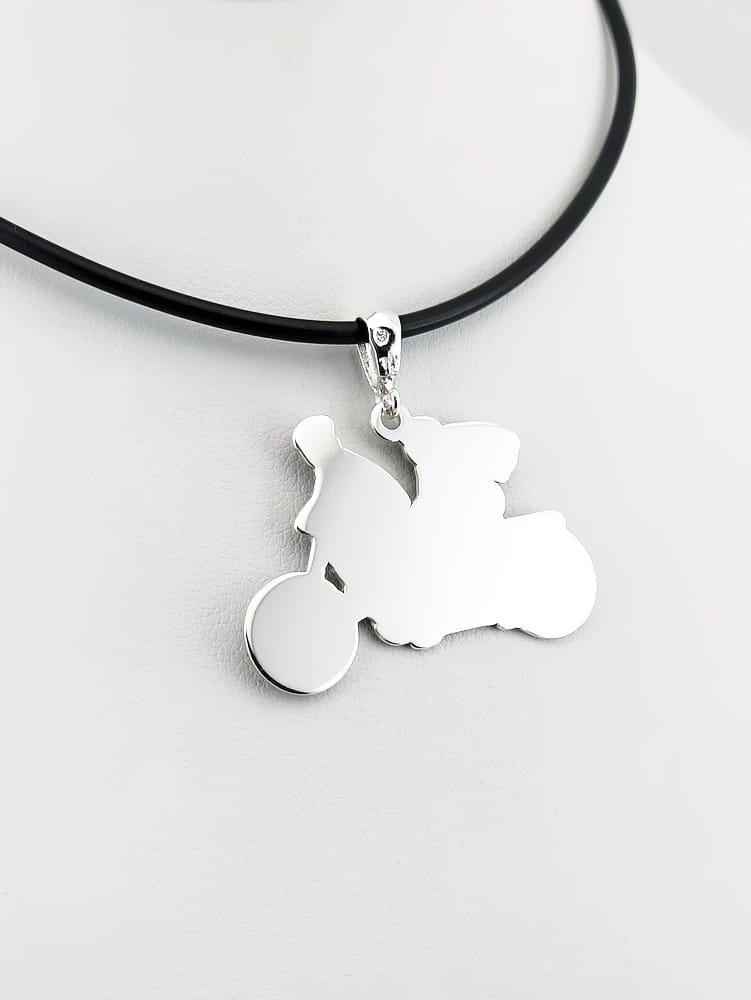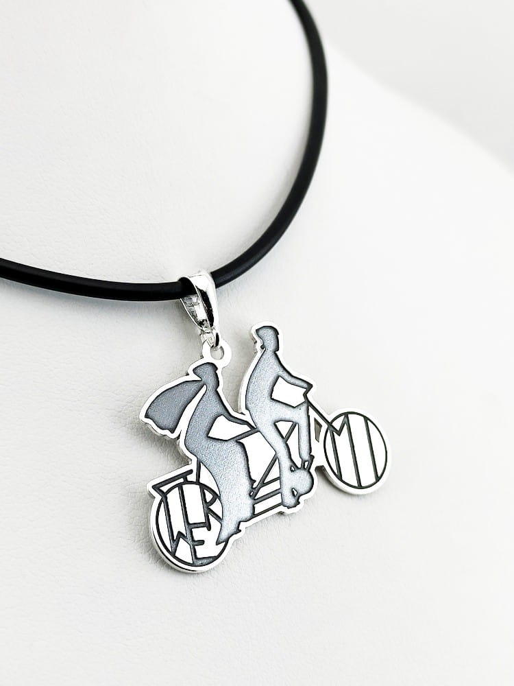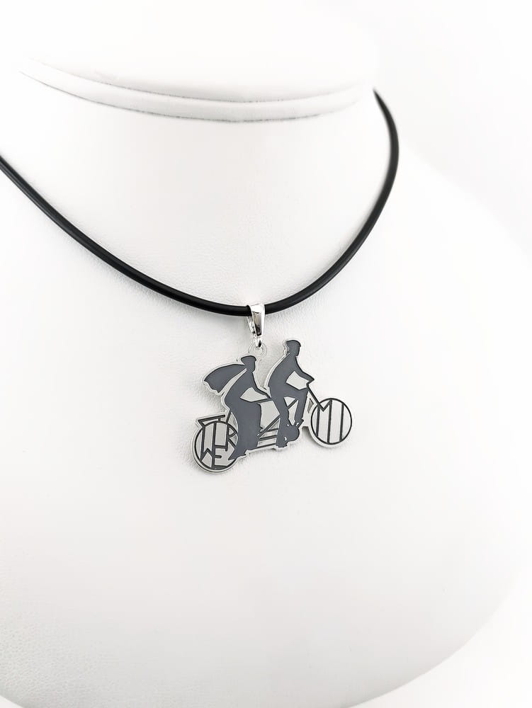 Lubimy wyzwania, para młoda, tandem, inicjały, zawieszka totalnie spersonalizowana. Pewnie, że tak. Klient przesłał swój pomysł i rysunek ślubnego tandemu. W oparciu o ten rysunek wykonaliśmy projekt zawieszki. Ze srebrnego materiału w próbie 925 wykonaliśmy wisior przedstawiający młodą parę na tandemie, w kołach rowerowych umieszczone są inicjały pary młodej. Całość została wygrawerowana, a tło dla kontrastu zaciemnione oksydą, tył i brzegi zostały wypolerowane. Jako że jest to prezent ślubny wykonaliśmy dla nowożeńców dwie jednakowe sztuki.