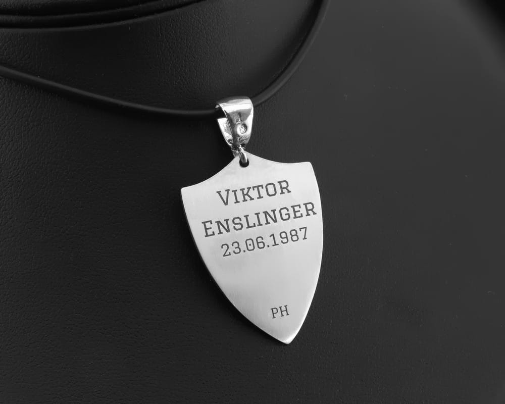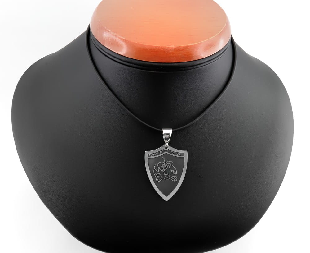 Srebrna zawieszka w kształtcie tarczy. Podobny wzór zawieszki przesłał klient i poprosił o przeróbkę wg swojego życzenia. Zmieniliśmy treść napisów na górze zawieszki oraz podmieniliśmy główny symbol na rysunek raka. Symbol ten i naposy są wypukłe a głębiej grawerowane tło, zostało przyciemnione. Na odwrocie wygrawerowaliśmy dedykację , której wielkość i formę również ustaliliśmy mailowo z klientem. Wysokość zawieszki to około 3,5 cm. Całość wykonana jest ze srebra pr 925.