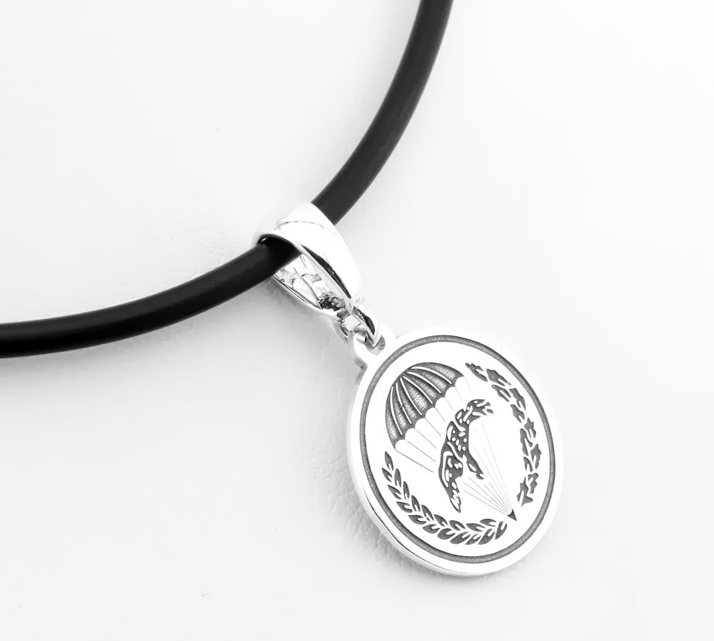 Na zamówienie klienta wykonaliśmy srebrną zawieszkę z oznaką rozpoznawczą Batalionu Powietrznodesantowego. Po otrzymaniu od zamawiającego konkretnej grafiki wykonaliśmy projekt techniczny. Ze srebrnego materiału w próbie 925 wykonaliśmy okrągły wisior. Elementy charakteryzujące oznakę zostały wygrawerowane i po oksydowane, natomiast całość wykończona na wysoki połysk. Grubość materiału zapewnia zawieszce sztywność i daje pewność, że przedmiot będzie cieszył przez lata.