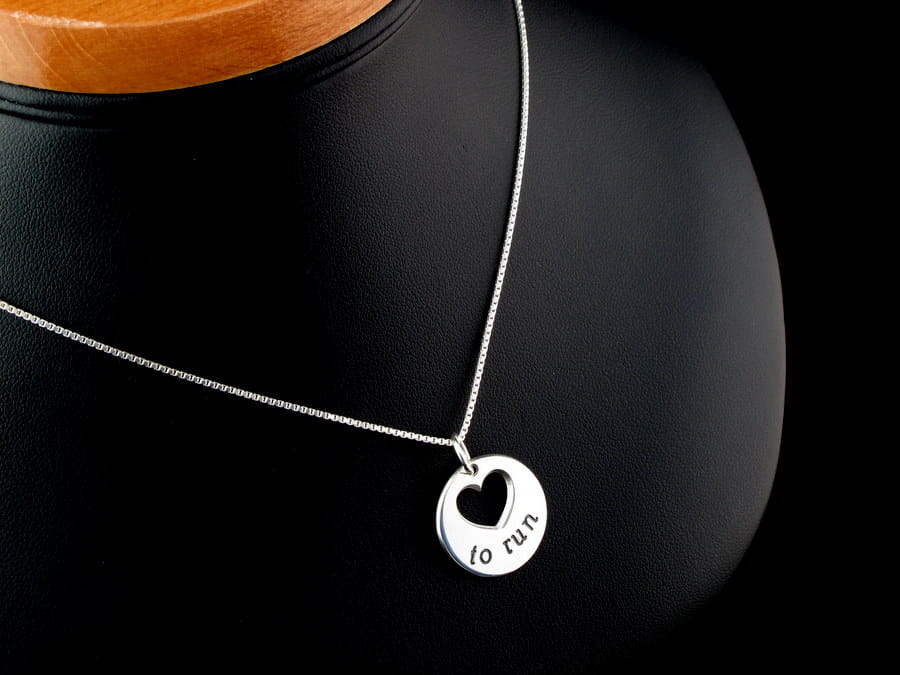 Srebrna okrągła zawieszka ze wciętym serduszkiem i głęboko grawerowanym napisem TO RUN. Klient przesłał do nas zdjęcie zawieszki na wzór, ustaliliśmy projekt i wielkość wisiorka i przygotowaliśmy zawieszkę. Średnica tej na zdjęciach to 19mm literki są bardzo głębokie i taki grawerunek nigdy się nie zniknie. Całość wycięta jest z arkusza srebra grubości 1mm. Możemy w podobnym stylu wykonać inną zawieszkę lub z innym napisem. Czekamy na kontakt :)