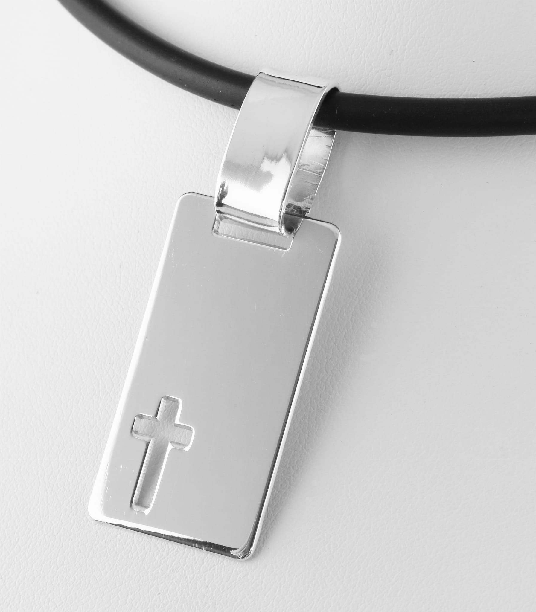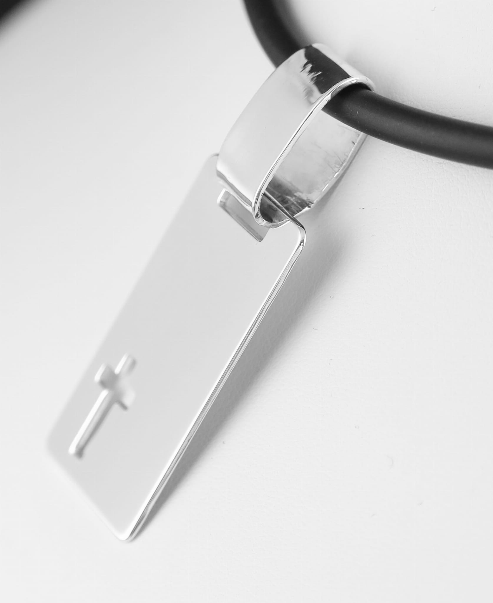 Wykonaliśmy dla naszego klienta masywną zawieszkę z frezowanym krzyżem oraz masywną wysoką przelotką, przygotowaną do masywnego łańcucha. Blaszka, jak i przelotka zostały wykonane ze srebrnego arkusza próby 925 o grubości 0,8 milimetra. Grubość ta zapewni sztywność nieśmiertelnika, a przelotka będzie służyć przez wiele lat. Zawieszka wykończona została na wysoki połysk, nadaje się ona pod grawerunek zdjęcia lub okolicznościowej dedykacji.