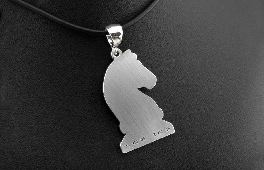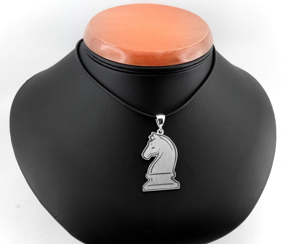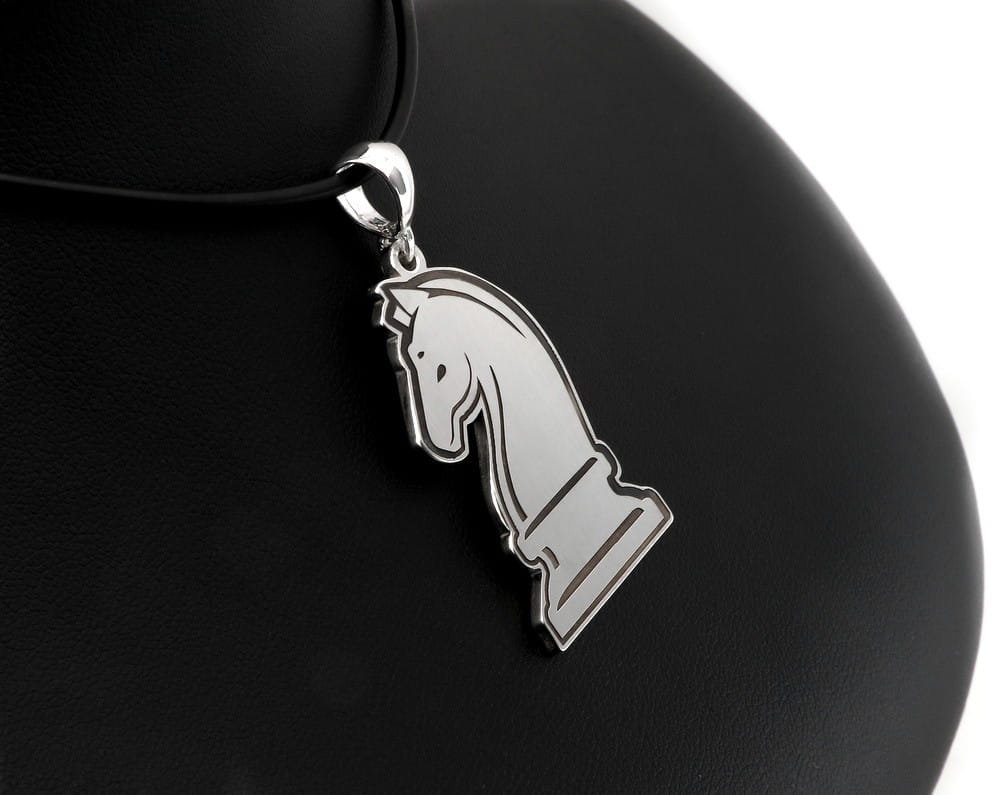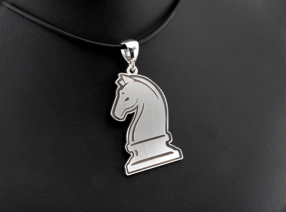 Ta solidna zawieszka w kształcie szachowej bierki to pomysł naszego klienta. Przesłał do nas zapytanie i kilka propozycji grafiki szachowego konika, które mu się podobały. Jeden z projektów dopasowaliśmy do możliwej do wykonania wersji. Zapropnowaliśmy dwie grubości, standardowy arkusz 1,0 mm oraz grubszy 1,5 mm i to właśnie ten cięższy model wybrał klient. Sama figura ma około 4 cm wysokości. Na przodzie szczegóły zostały wygrawerowane głęboko i przyciemnione oksydą. Przód i tył wykończone są na matowo a kontur zawieszki jest wypolerowany. Dodatkowo na odwrocie zawieszki klient poprosił o wygrawerowanie krótkiej notacji szachowego otwarcia. Przyznaję, że mi jako szachowemu fanowi wykonanie tej zawieszki sprawiło dużo frajdy. Jeśli szukają Państwo podobnej biżuterii, chętnie pomogę ją wykonać.