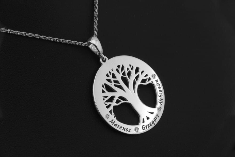 Klient poprosił nas by wykonać dla niego srebrną zawieszkę z motywem drzewa. Chodziło mu o to by było widać korzenie oraz gałęzie mocnego drzewa i wkomponować gdzieś trzy imiona. Postanowiliśmy kształt drzewa wpisać w okrąg. W ten sposób zawieszka nie haczy a drzewo nadal ładnie się prezntuje i jest miejsce by czytelnie wygrawerować imiona. By zachować ładną symetrię imiona rozdzielone zostały oprawionymi cyrkoniami. Czcionkę i szerokość napisów dobraliśmy tak by układały się one możliwe równomiernie po obwodzie. Samo okrąg miał średnicę około 3 - 3,5 cm. Całość wykonana jest ze srebra pr 925. Przed wykonaniem wysłalismy projekt w skali 1:1 do oceny.