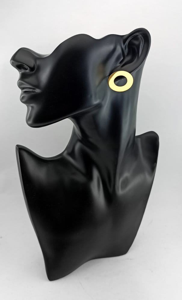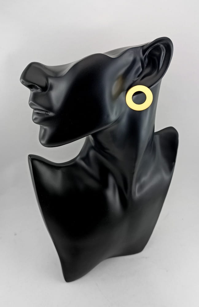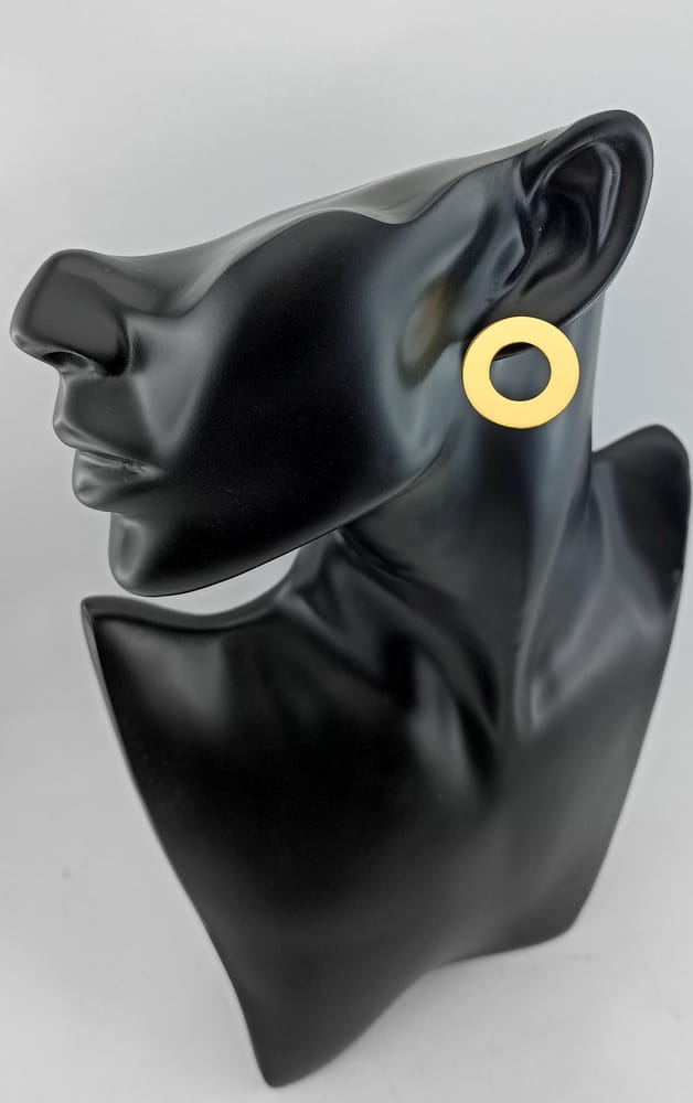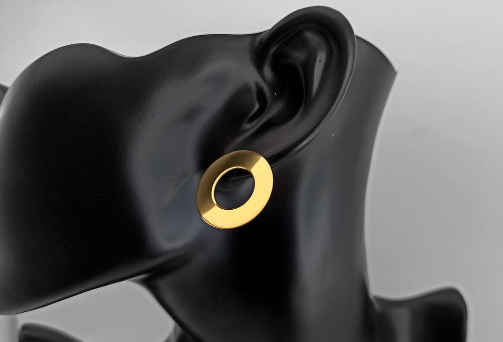 O koczyki dla żony w takiej formie poprosił nas nasz klient. Szukałą ona takiego wzoru w internecie ale bez skutku. Jako, że jest to dość prosta forma wykonaliśmy je ekspresowo już na dzień następny. Wcześniej przygotowaliśmy kilka wzorów do oceny, o różnych średnicach i o różnej wielkości otoworów. Po wybraniu konkretnego wzoru zabraliśmy się do pracy. Kolczyki wyciętę są z arkusza srebra i wypolerowane. Mocowane są tradycyjnie na sztyft z zatyczką w formie baranka. Na koniec kolczyki zostały kąpielowo pozłocone. Podobne kolczyki możemy wykonać w innym rozmiarze i innym kształcie. Wystarczy przesłać do nas zapytanie i krótki opis jak mają wyglądać (kształt , rozmiar, prosty rysunek...)
