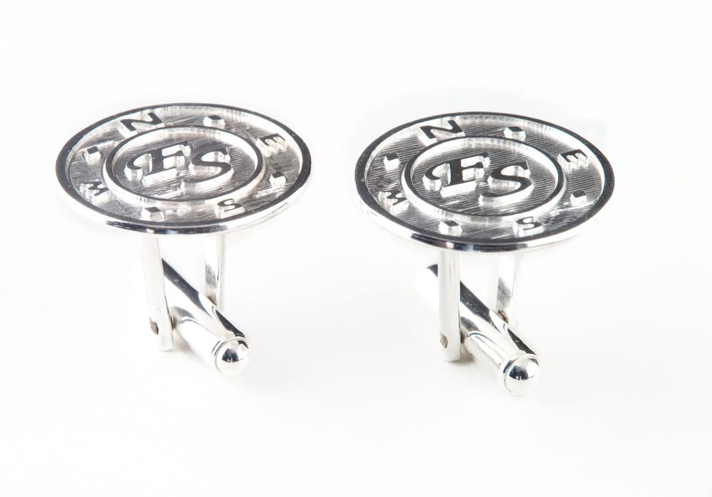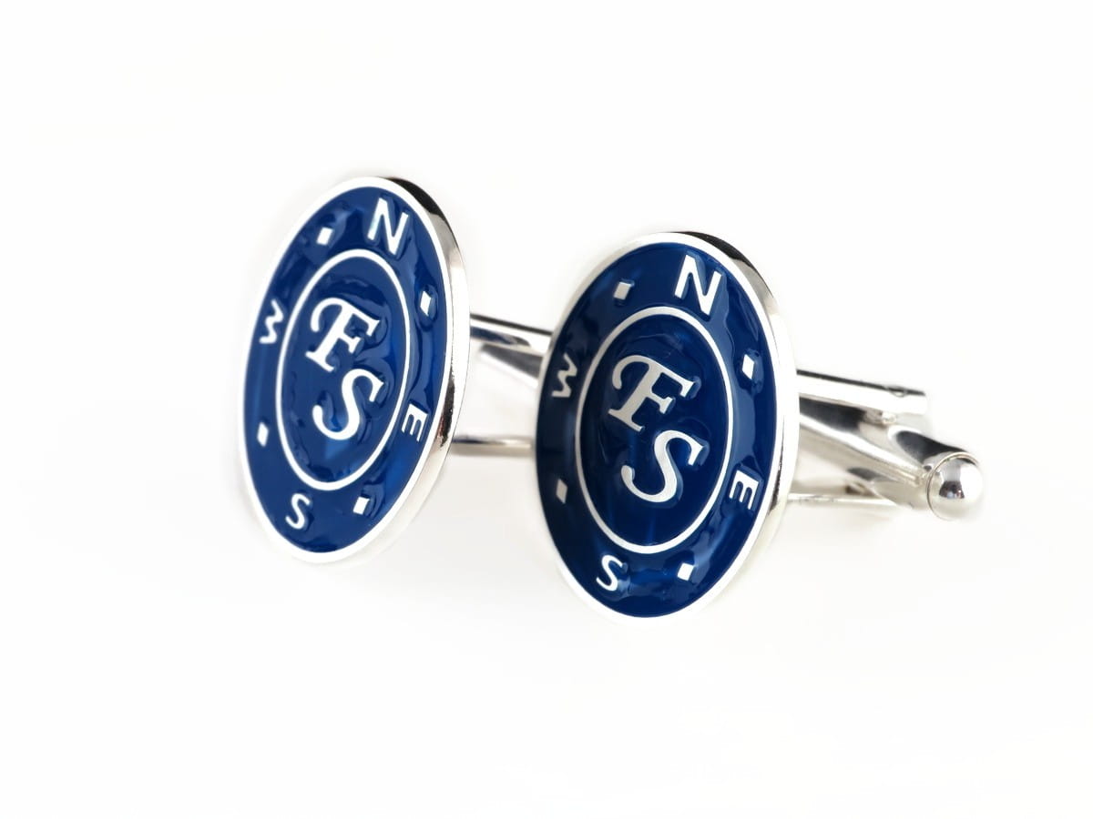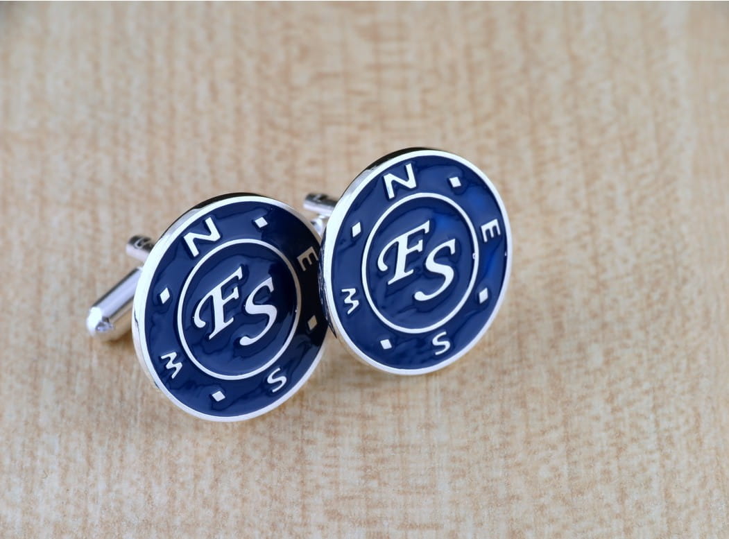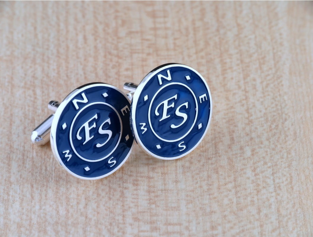 Na życzenie klientki wykonaliśmy srebrne, personalizowane spinki do mankietów. Po uzgodnienieniach projektowych udało się otrzymać interesujący efekt, którym są inicjały połączone z kompaem i różą wiatrów. Symbol "N", czyli kierunek północny został powiększony względem pozostałych. W srebrnej blaszce o próbie 925 wyfrezowaliśmy tło w taki sposób, aby srebrne elementy ozdobne były niejako wystającymi „wyspami", nadaliśmy im odpowiedni kształt i poddaliśmy dalszej obróbce (lutowanie, polerowanie). Ostatni etap to nakładanie jubilerskiej emalii w kolorze królewskiego błękitu. Całość została wygrzana w piecu, aby utwardzić kolorową masę. Efektem tych zabiegów są spinki, których tafla jest połączeniem srebra i emalii w wymiarze 20 mm. Jeśli interesuje Państwa podobna biżuteria prosimy o kontakt.