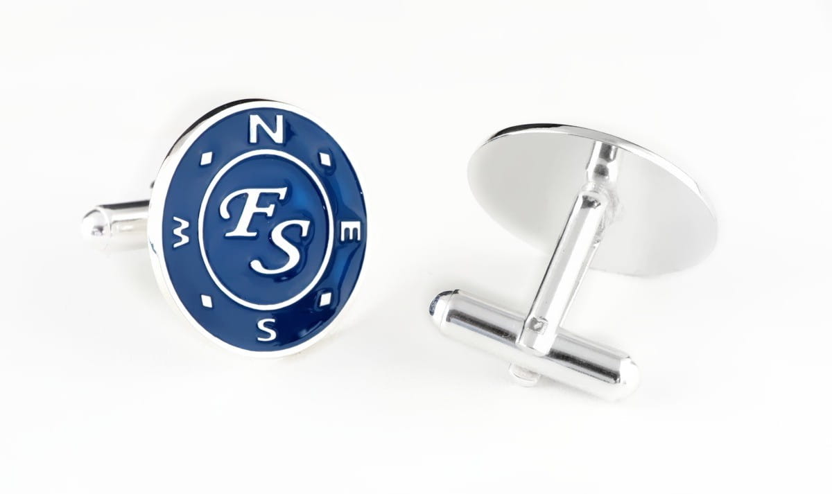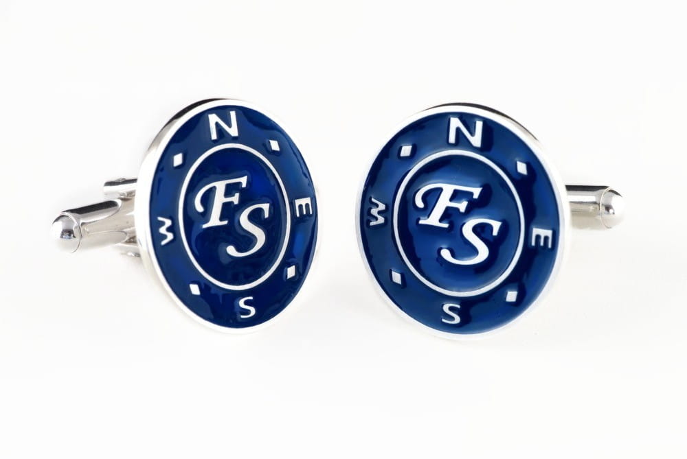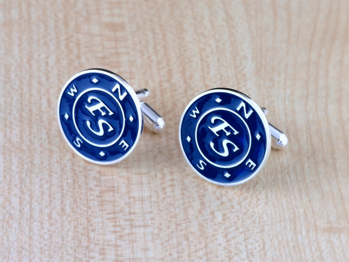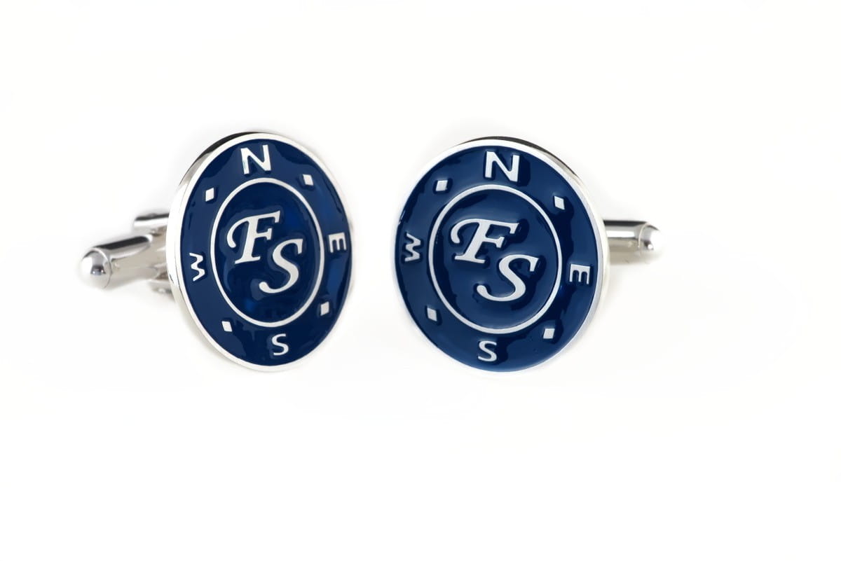 Na życzenie klientki wykonaliśmy srebrne, personalizowane spinki do mankietów. Po uzgodnienieniach projektowych udało się otrzymać interesujący efekt, którym są inicjały połączone z kompaem i różą wiatrów. Symbol "N", czyli kierunek północny został powiększony względem pozostałych. W srebrnej blaszce o próbie 925 wyfrezowaliśmy tło w taki sposób, aby srebrne elementy ozdobne były niejako wystającymi „wyspami", nadaliśmy im odpowiedni kształt i poddaliśmy dalszej obróbce (lutowanie, polerowanie). Ostatni etap to nakładanie jubilerskiej emalii w kolorze królewskiego błękitu. Całość została wygrzana w piecu, aby utwardzić kolorową masę. Efektem tych zabiegów są spinki, których tafla jest połączeniem srebra i emalii w wymiarze 20 mm. Jeśli interesuje Państwa podobna biżuteria prosimy o kontakt.