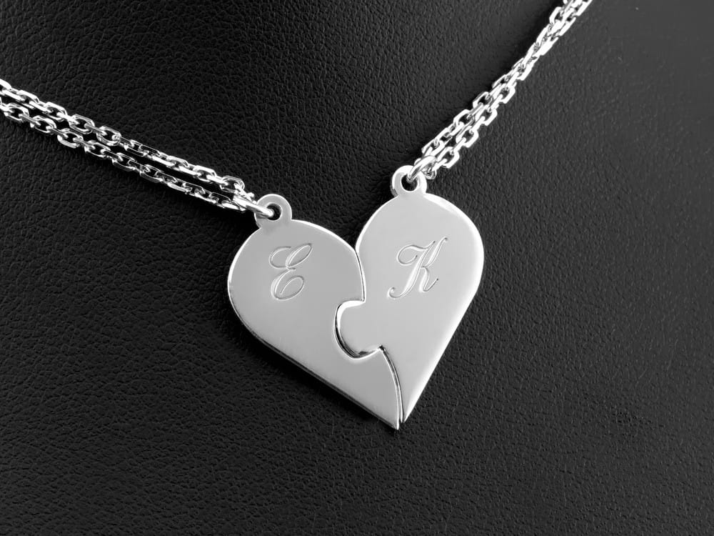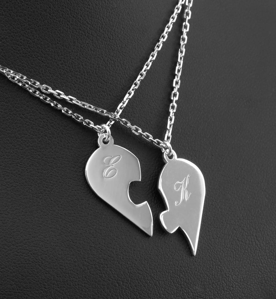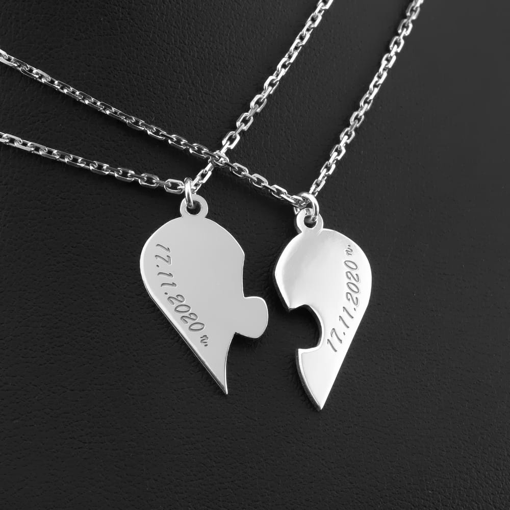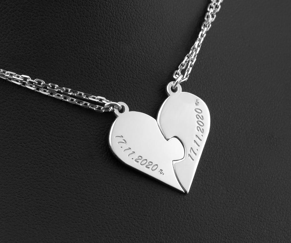 O taką zawieszkę poprosiła nas klientka. Przesłała swój odręczny rysunek jako schemat. Na tej podstawie dobraliśmy wpólnie pasujący kształt serca, wielkość emelmentów i sposób mocowania. Obie połówki serca sa dopasowana do siebie nawazajem na wcisk. Złączone siędzą stabilnie i nie rozpadną się. Klientka poprosiła by zamocować każdą połówkę na stałe po środku łancuszków. Dodatkowo wykonaliś grawerunek wg formy również zaznaczonej przez klientka na odręcznym rysunku. Chodziło o rozmieszczenie tekstu jak i krój pisma. Po ustaleniu projektu przystąpiliśmy do pracy. Wykonany komplet został sfotografowany w studio i zdjęcia przesłaliśmy do oceny.