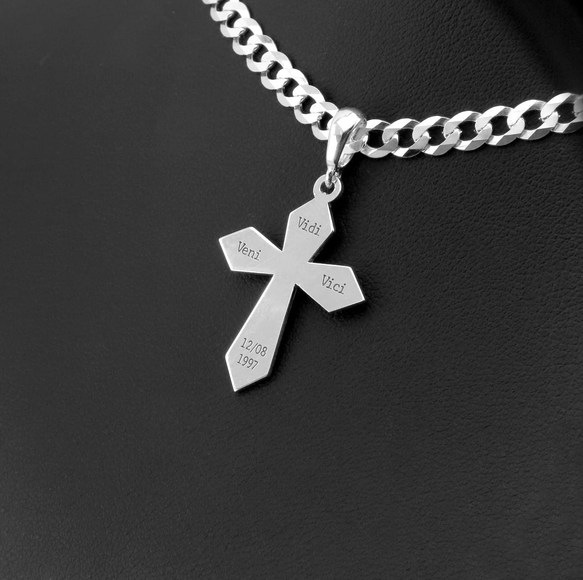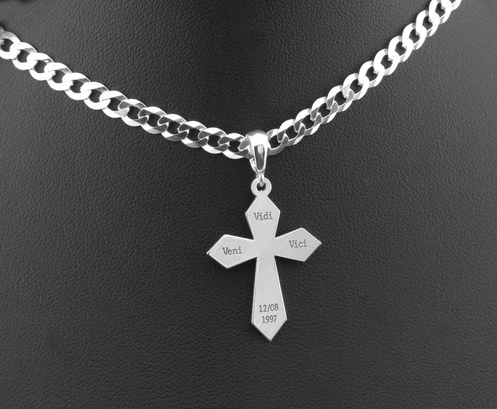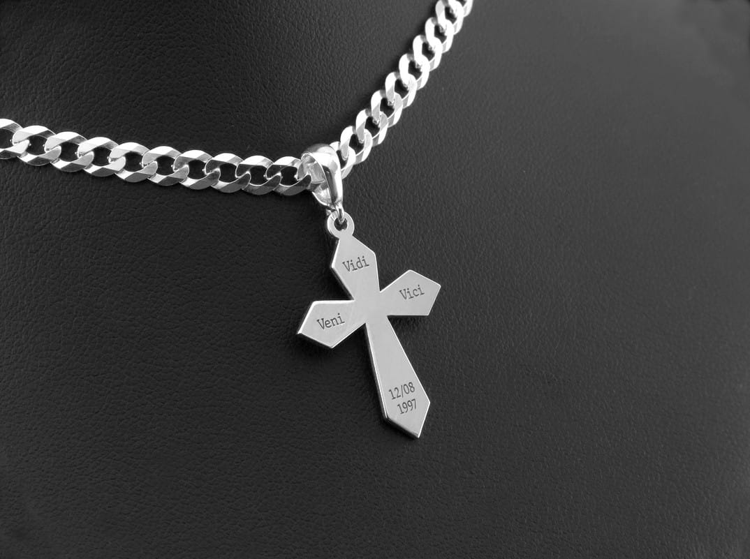 Na życzenie klienta wykonaliśmy srebrny krzyżyk z grawerunkiem cytatu Gajusa Juliusza Cezara, słynne „Veni, Vidi, Vici". Klienta przesłał swój pomysł w formie przykładowego zdjęcia. Po ustaleniu wszelkich szczegółów dotyczących wielkości oraz kroju czcionki wykorzystanej do grawerunku przystąpiliśmy do pracy. Ze srebrnego arkusza w próbie 925 wycięliśmy kształt krzyża, został on ręcznie wypolerowany na wysoki połysk, ostatnim szlifem pozostało naniesienie grawerunku słynnych słów oraz daty przesłanej przez klienta. Zawieszkę wieńczy krawatka dobrana odpowiednio pod wielkość łańcuszka wybranego dodatkowo przez pomysłodawcę. Jeśli chcesz mieć ulubiony cytat zawsze przy sobie lub masz pomysł na spersonalizowaną biżuterię, zapraszamy do kontaktu.