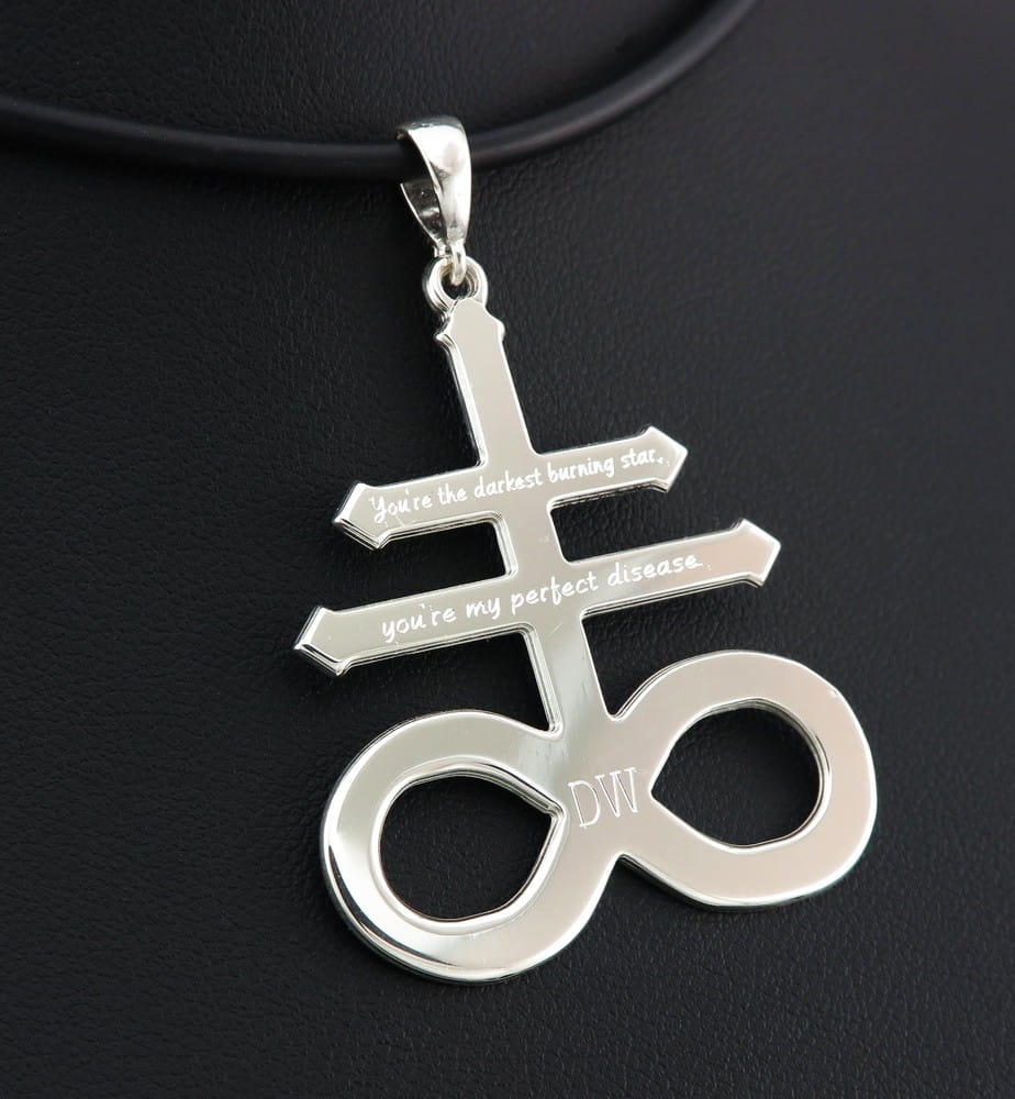 Srebrna zawieszka wykonana wg pomysłu i wzoru klienta. Wielkość krzyża to 35 × 43 mm. Całość wykonana jest ze srebra próby 925. Gruby materiał zapewnia sztywność wisiora, co gwarantuje, że cieszył on będzie właściciela przez długie lata. Cały wisior wykończony został na wysoki połysk, a na poprzecznych ramionach wykonano osobistą dedykację. Przed wykonaniem wysłaliśmy projekt w skali 1:1 do oceny.