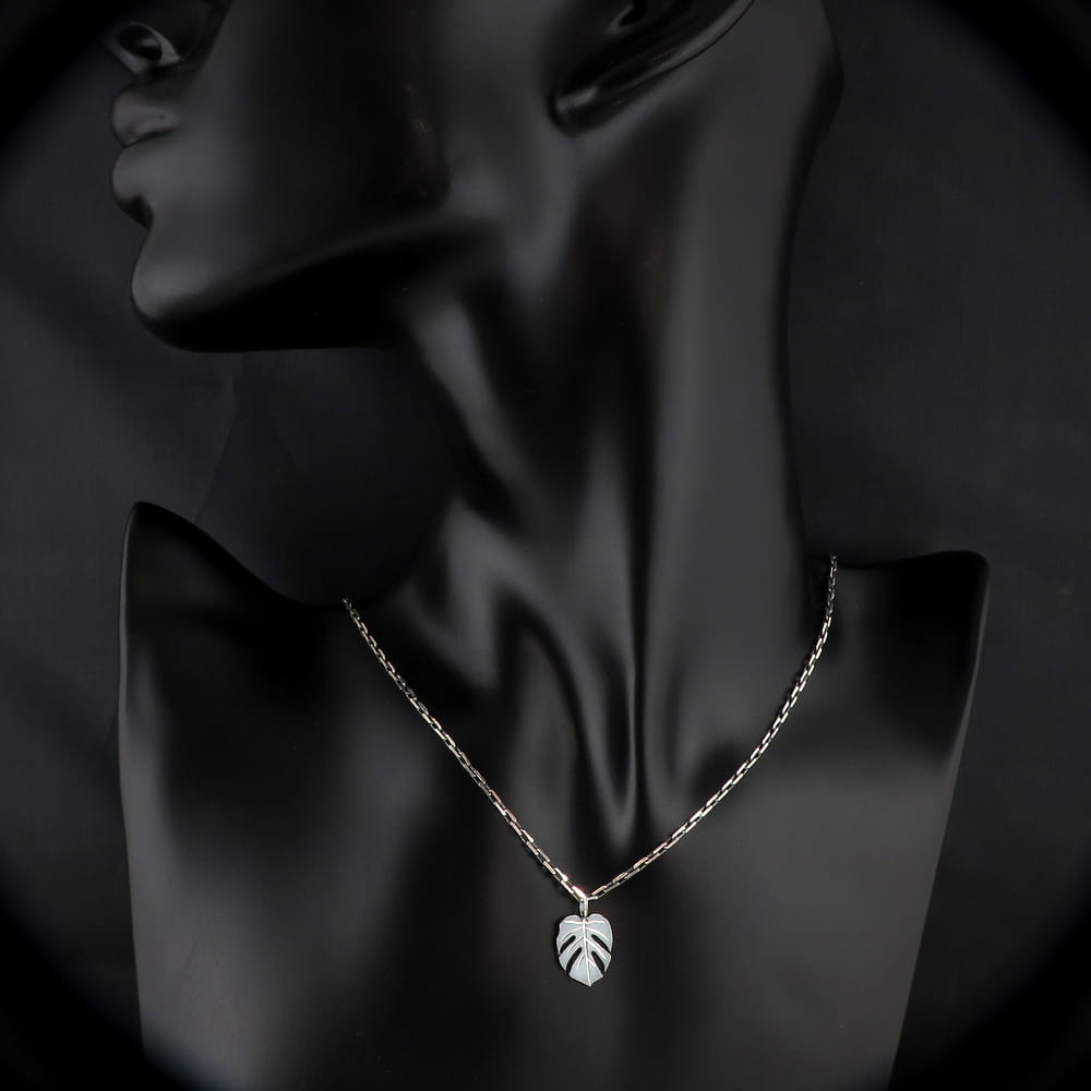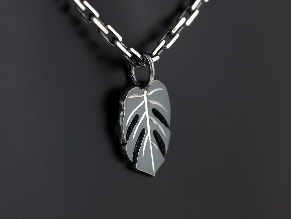 Srebrna zawieszka w kształcie liścia monstery. Projekt zawieszki wraz z wymiarami i przykładowymi zdjęciami przesłał do nas klient emailem. W oparciu o przesłany materiał wybraliśmy formę wykonania zawieszki, czyli oksydowaną z zewnątrz zawieszkę i błyszczące, ciętę rylcem grawerskim ścieżki na liściu. Sam liść jest niewielki, ma około 12 x 14 mm. Do kompletu dobraliśmy również oksydowany łańcuszek, dopasowany na długość 50cm. Na odwrocie zawieszki wygrawerowaliśmy błyszczące inicjały. Całość wykonana jest ze srebra pr. 925.