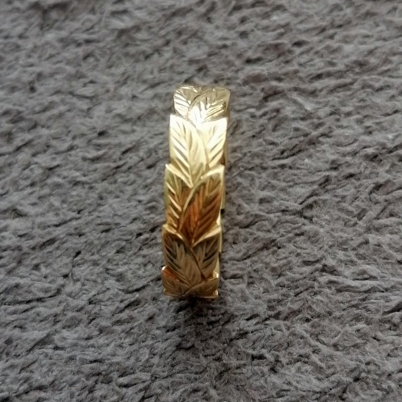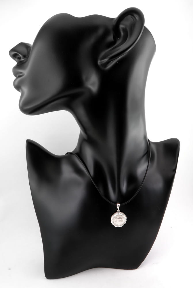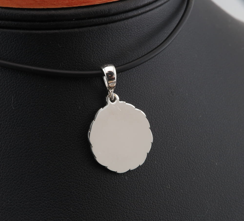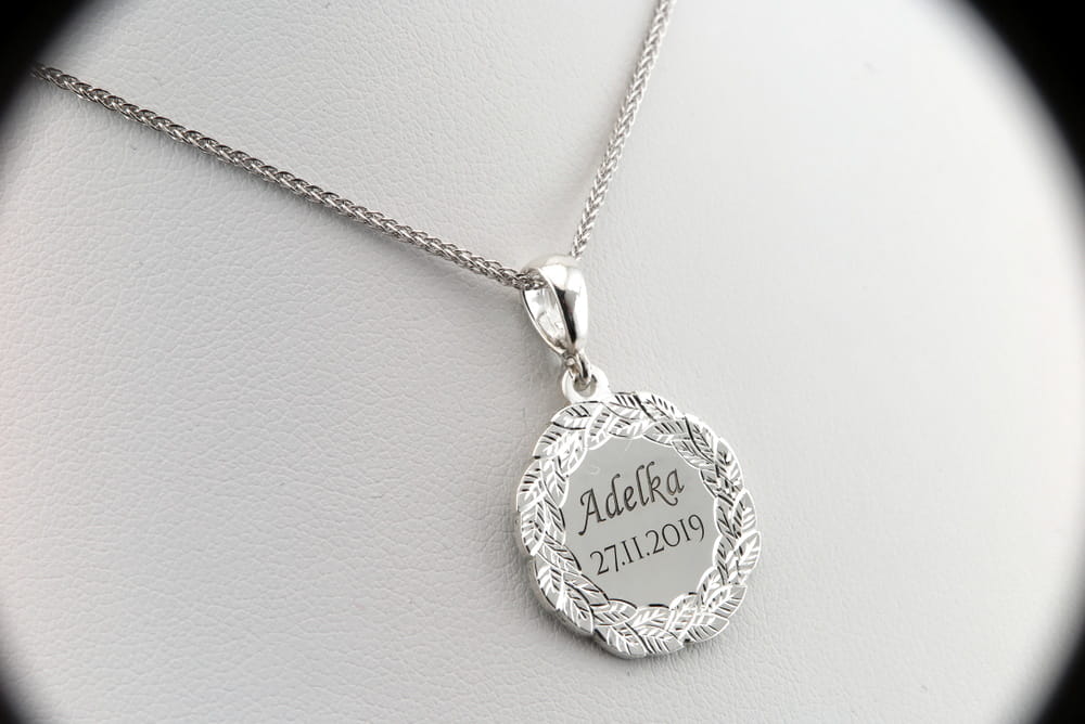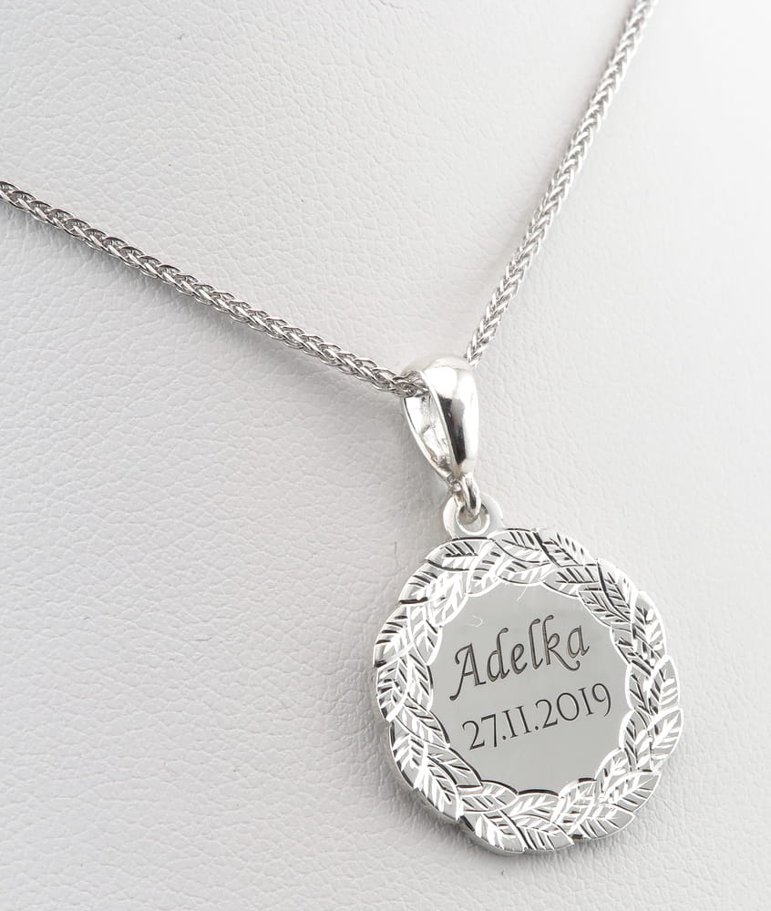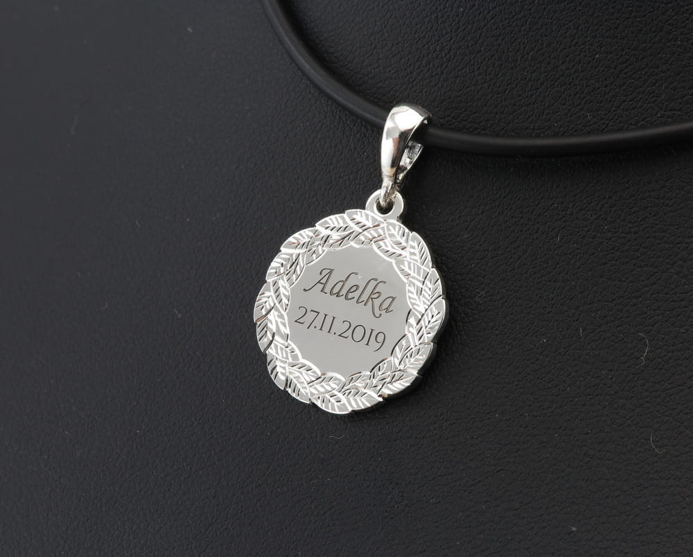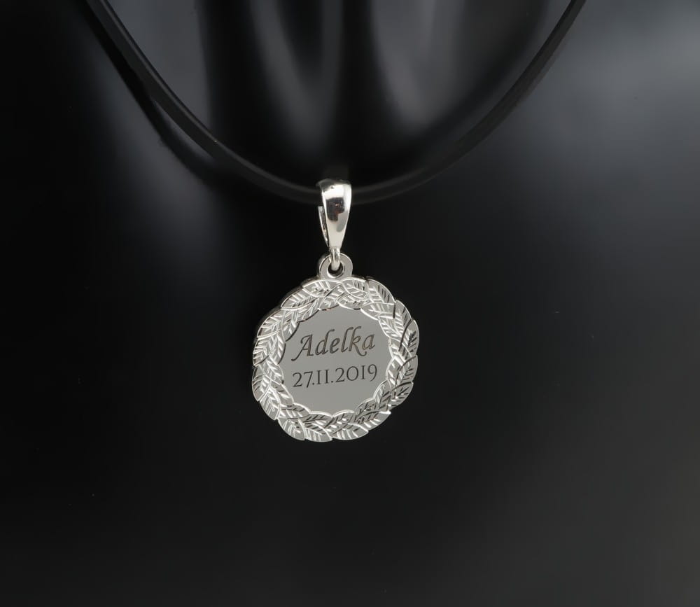 Pomysł i wzór na ten oryginalny medalik i zapytanie o możliwość wykonania przesłał do nas klient wraz ze zdjęciem swojej obrączki i odręcznym rysunkiem. Widoczny na zdjęciach wzór wieńca wzorowany był na obrączce ślubnej z tym właśnie motywem. Wzór liści jest ręcznie grawerowany na zewnątrz obrączki i w podonbym stylu również ręcznie grawerowany jest wieniec wokoł medalika. Był to stosunkowo mały medalik, średnicy około 19 mm. Po środku głęboko wygrawrowane zostało imię i data. Zarówno ręczne wykonanie grawerunku jak i samo projektowanie były bardziej czasochłonnymi czynnościami, ale efekt końcowy robi wrażenie. Cięte rylcem grawerwskim krawędzie pięknie się błyszczą i efekt ten jest bardzo trwały. Całość wykonana jest ze srebra pr. 925.