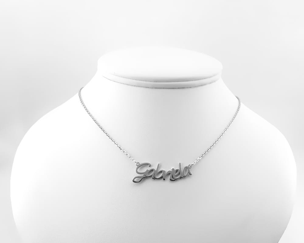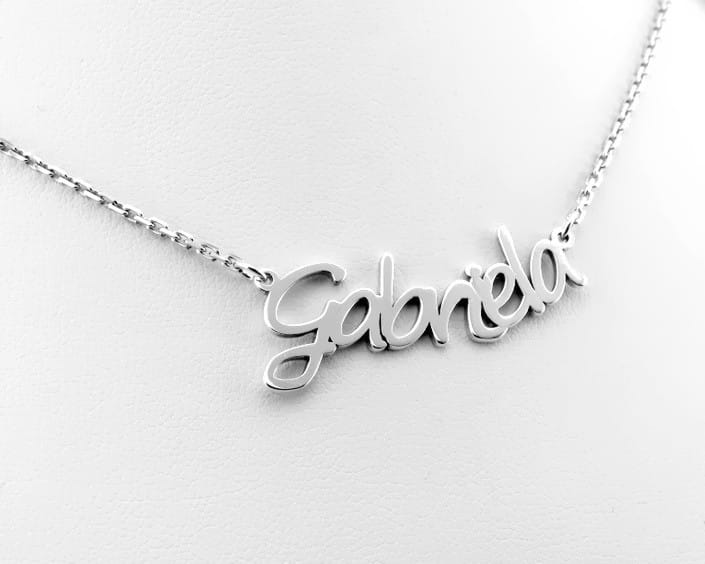 Taki oto naszyjnik wykonaliśmy na zamówienie dla klientki. Zaproponowaliśmy formę napisu w lekkim łuku i trwał splot łańcuszka. Projekt pokazaliśmy na miejscu w sklepie i dobraliśmy pasującą wielkość imienia. Po akceptacji w kilka dni naszyjnik był gotowy do odbioru.
