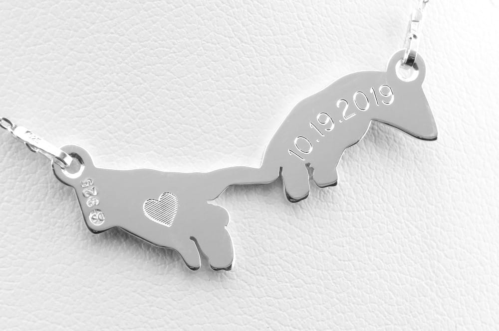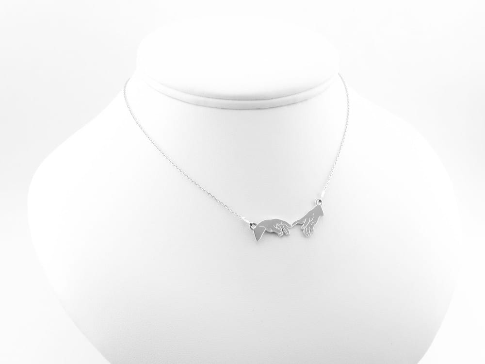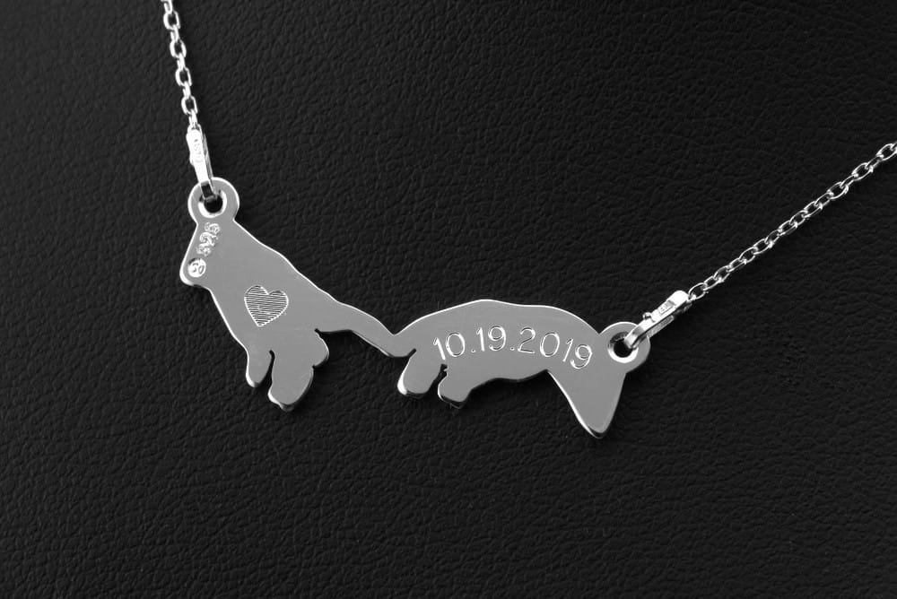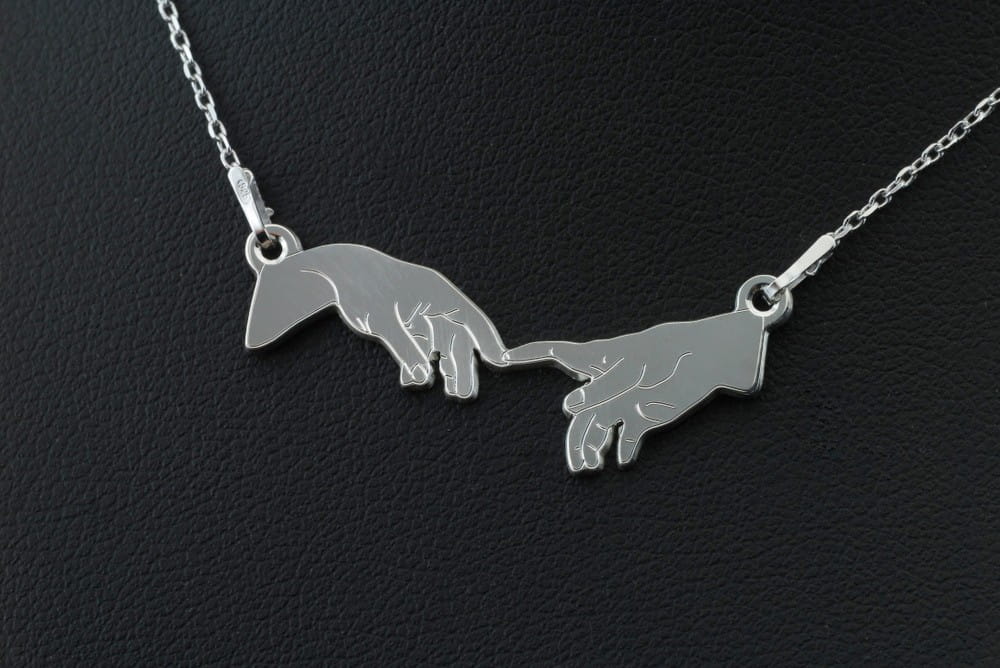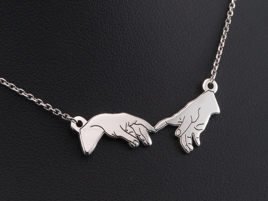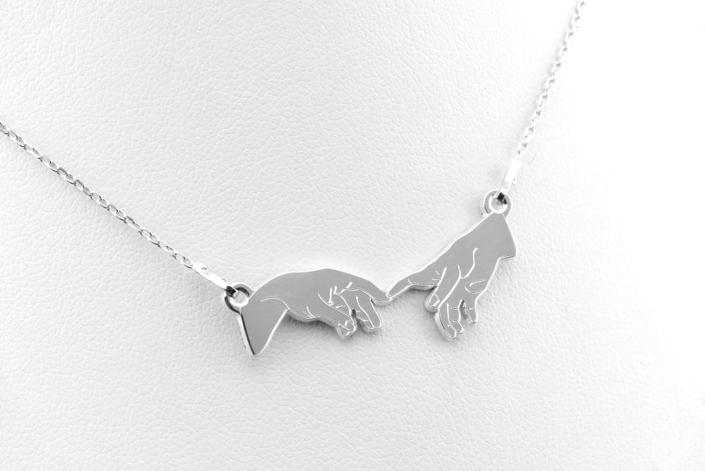 Na życzenie klienta wykonaliśmy naszyjnik „Stworzenie Adama". Inspiracją był słynny fresk z Kaplicy Sykstyńskiej. Motyw stykających się dłoni i palców ludzkiego i boskiego, przystosowaliśmy graficznie i wykonaliśmy w srebrze próby 925, grubość arkusza to 1 mm, zapewni ona sztywność elementu ozdobnego naszyjnika i pozwoli cieszyć się nim długie lata. Zawieszka została wypolerowana na wysoki połysk oraz opatrzona okolicznościowym grawerunkiem. „Stworzenie Adama” zostało zamontowane na drobnym łańcuszku o splocie brilantata, nadaje się od świetnie naszyjników typu celebrytka, nadaje mu lekkości i subtelności.