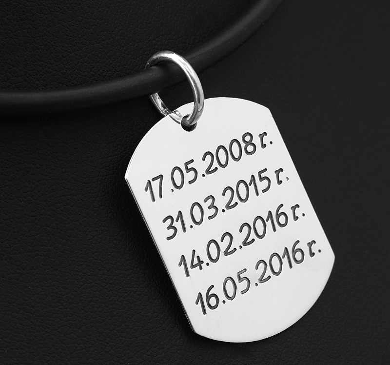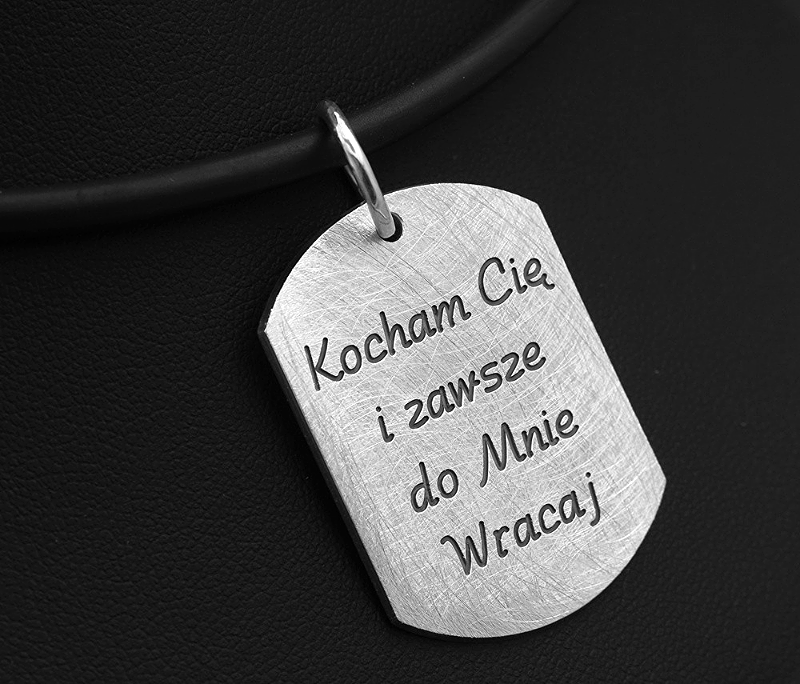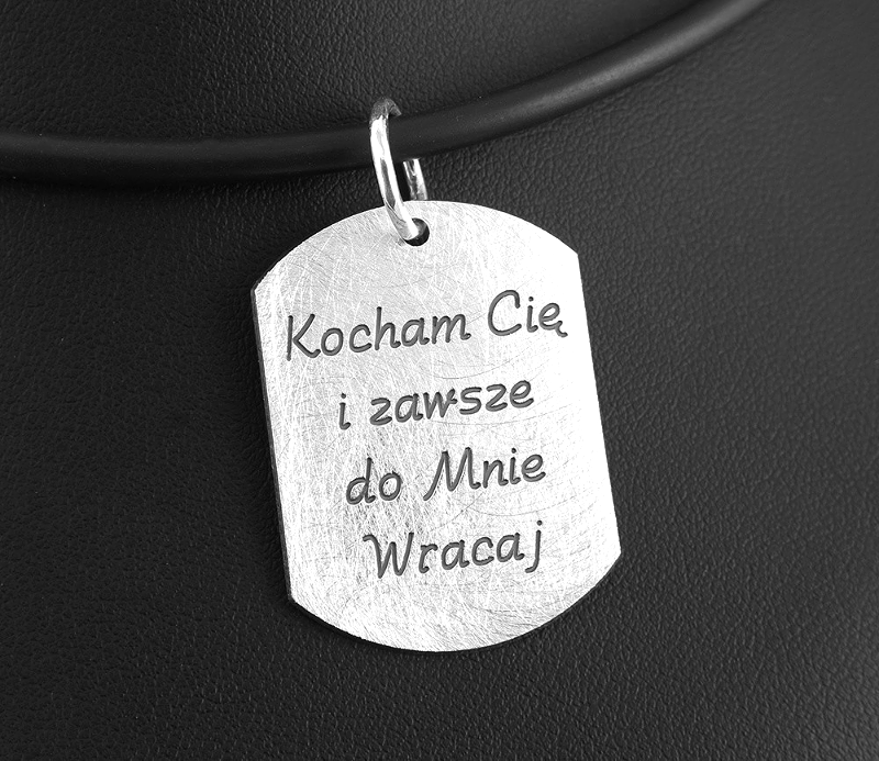 Na zamówienie klienta wykonaliśmy w naszej pracowni duży srebrny nieśmiertelnik o próbie 925. Zawieszka została wykonana z materiału o grubości 1 mm, co zapewnia jej sztywność i trwałość. Głęboki frezowany napis został zaciemniony oksydą gwarantuje to czytelność i przykuwa uwagę. Boki i tył zostały ręcznie wypolerowane na wysoki połysk, a front zawieszki zmatowiony diamentową ściernicą, zabieg ten dodaje zawieszce oryginalnego wyglądu. Wisior w całości ma wymiary 26 × 35 mm. Do zestawu dopasowaliśmy grubszy kauczukowy naszyjnik.