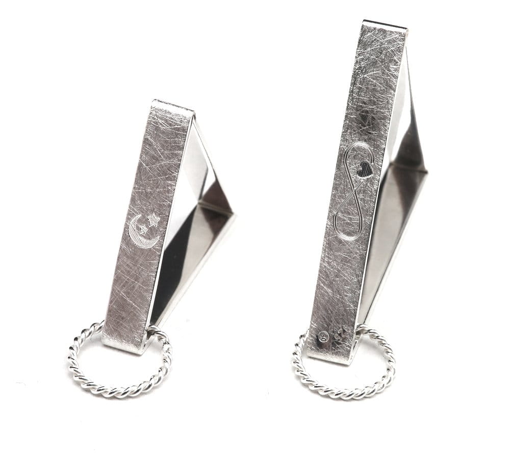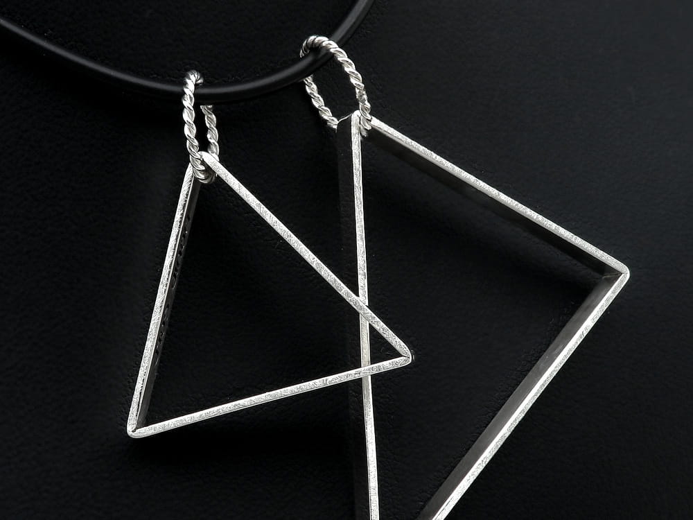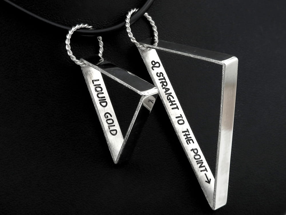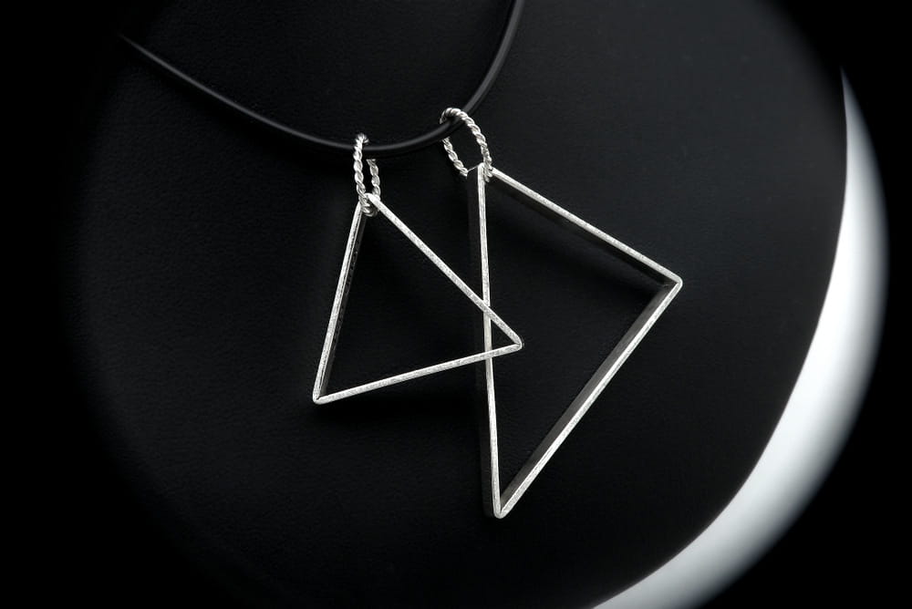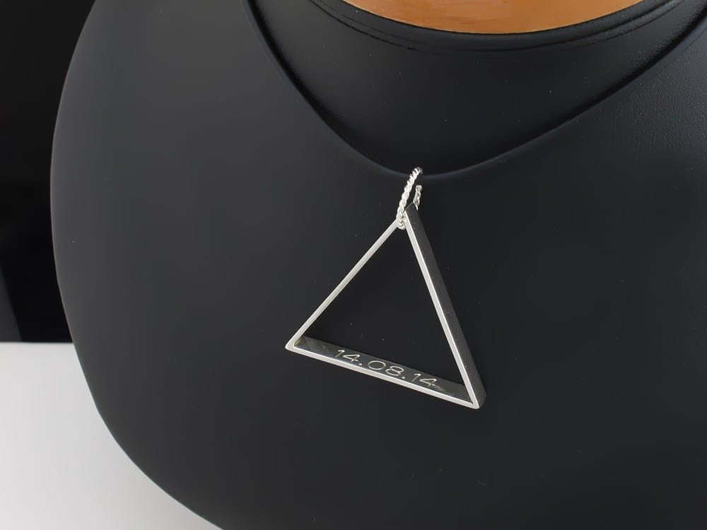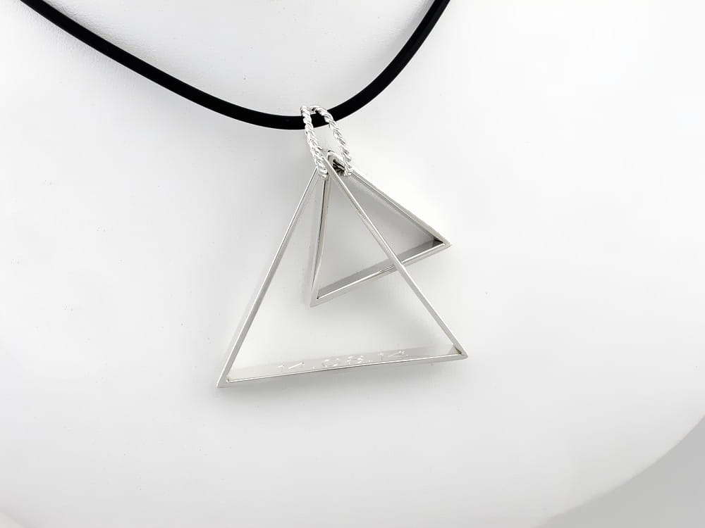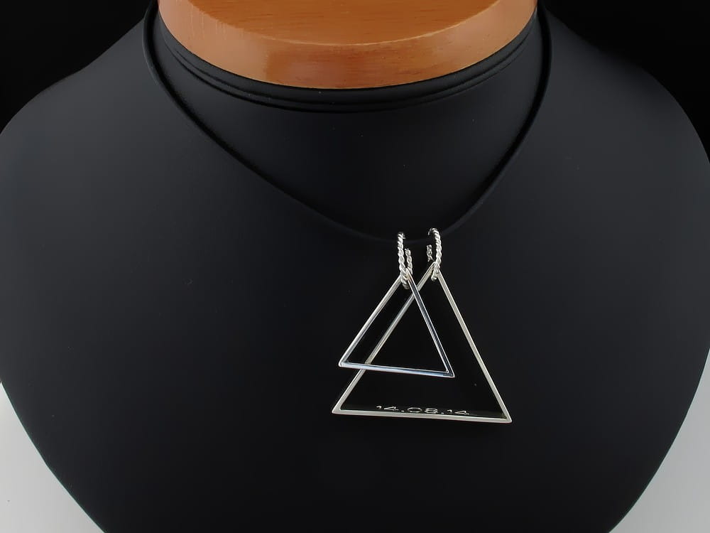 Dwa srebrne wisiory, duży i mały trókąt równoboczny. Większy ma od wewnątrz na jednym ramieniu grawerowaną datę. Grawerunek wykonany jest frezem. Powierzchnia może być wykończona jest na połysk lub elegancki mat. Wstępnie zawieszki miały być połączone jednym kółeczkiem, ale ostatecznie każdy trójkąt jest osobną zawieszką. Całość wykonana jest ze srebra pr. 925.
