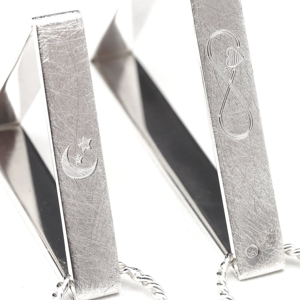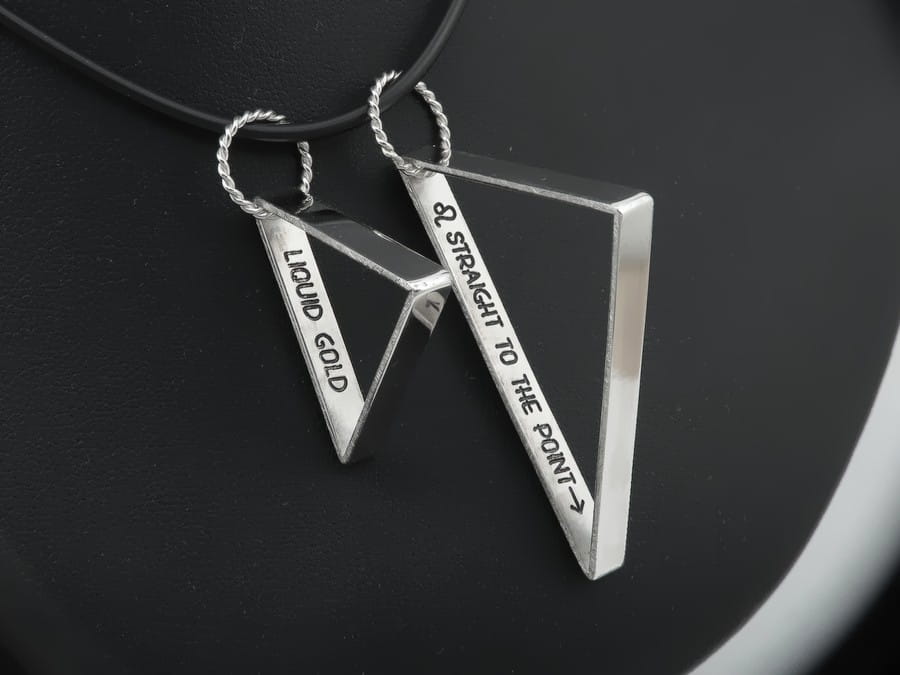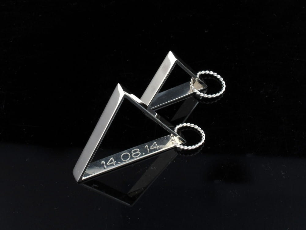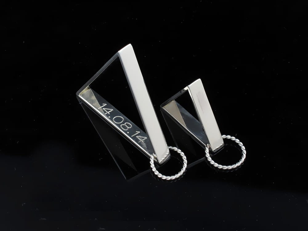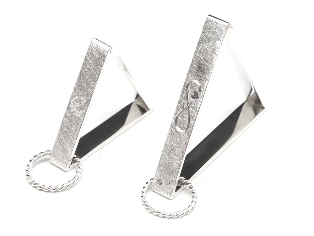 Kształt i wielkość zawieszek możemy zmienić na życzenie. Jako przykład dodaliśmy kilka zdjęć zawieszek trójkąta prostokątnego z grawerunkiem zaczernionym oksydą do srebra. Przed pracą wysyłamy projekt do oceny.