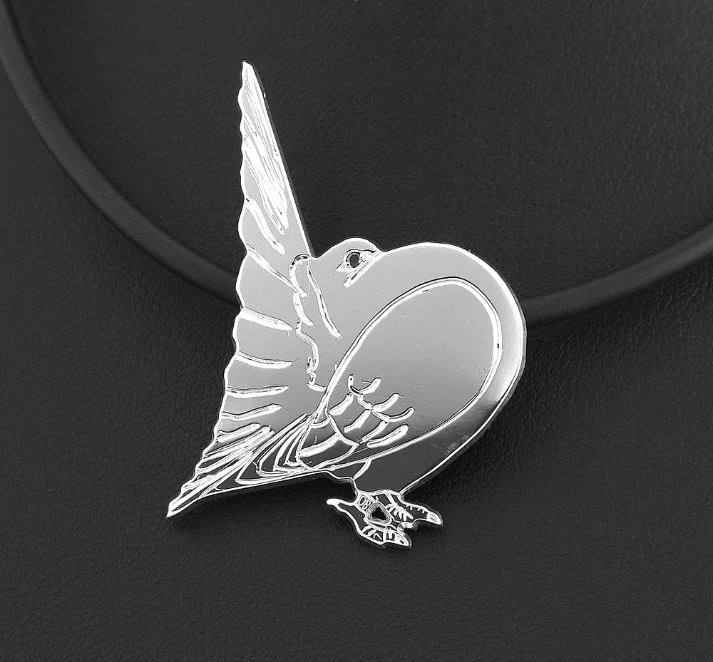 Zawieszka wykonana ze srebra pr. 925. w kształcie gołębia, a konkretnie pawika. Model zaproponowany przez klientkę przeszedł obróbkę w naszej pracowni a projekt został wysłany do akceptacji po ustaleniu rozmiarów zawieszki. Cały kształt wycięty jest z arkusza grubości 1mm. Szczegóły na powierzchni są głęboko grawerowane przy użyciu rylca, błyszczące i bardzo trwałe. Dodakowo w miejscu oka oprawiony jest maleńki, czarny onyks. Prowadzenie na łańcuszek jest umieszczeone z tyłu zawieszki, gdzie przylutowane są dwie duże przelotki na splot łańcuszka szerokości do 6mm. Jeśli intertesuje Państwa podobny model biżuterii prosimy o kontakt.