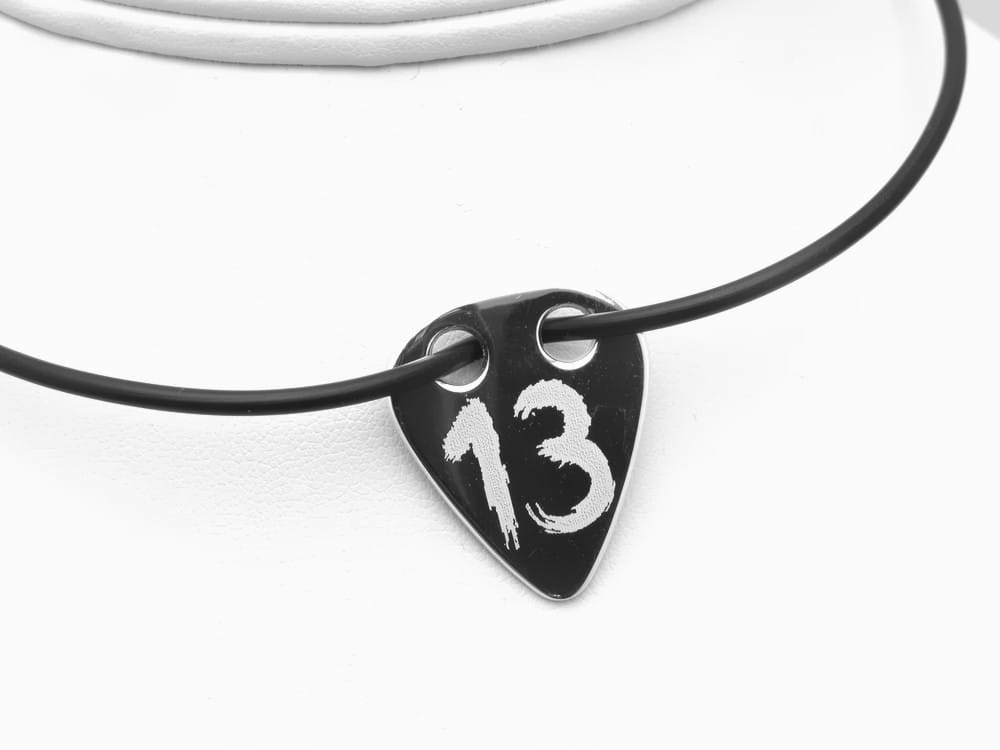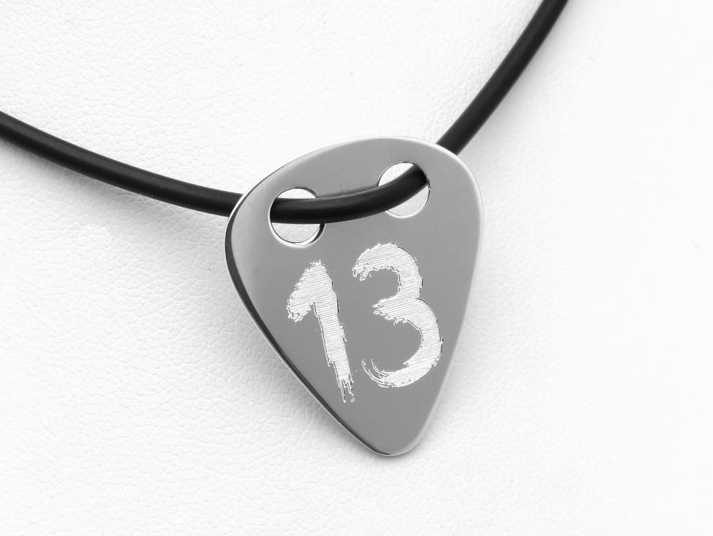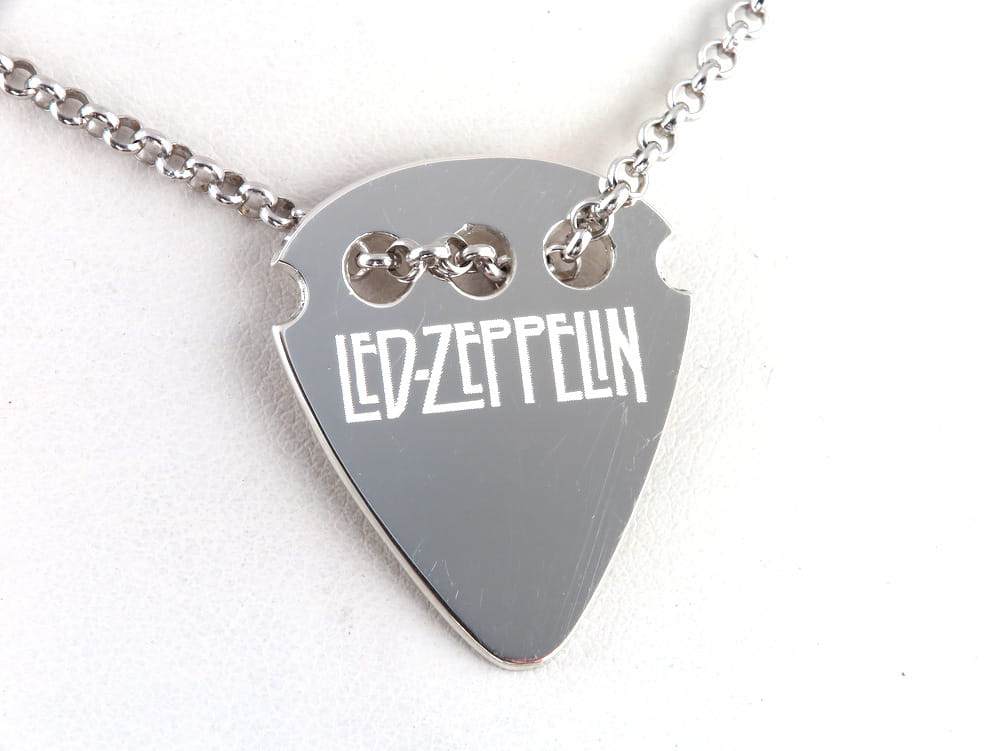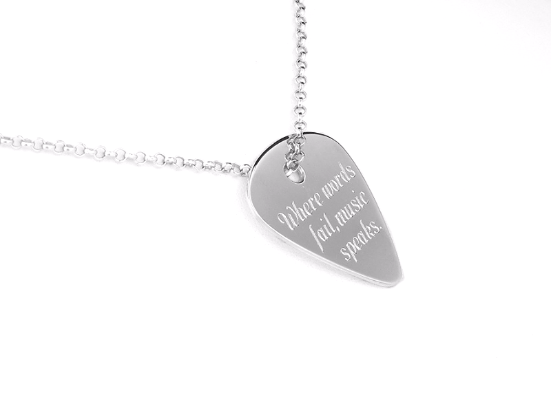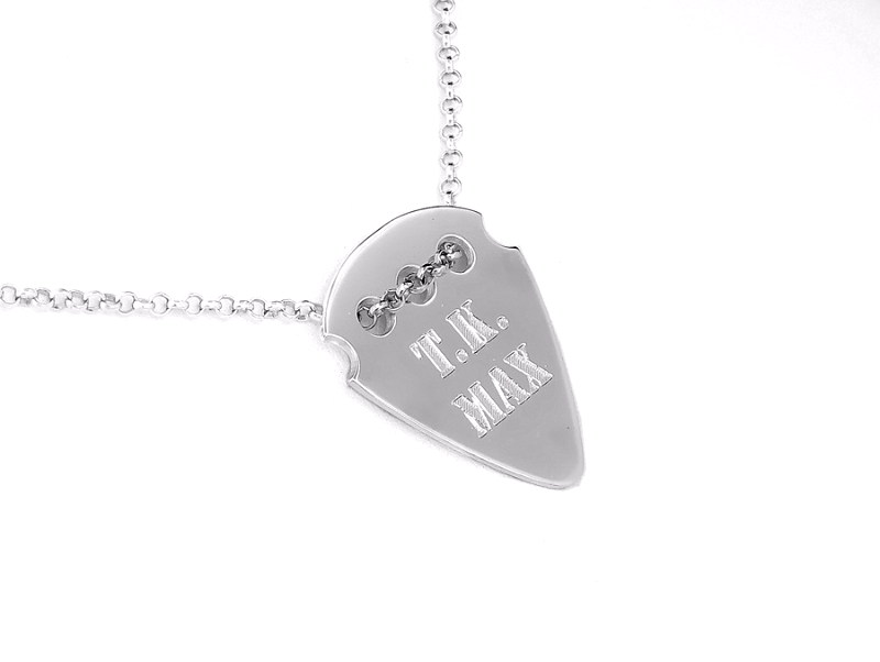Wisiorek ze srebra stylizowany na kształt kostki do gry na gitarze. Wykonany ze srebra pr. 925 na życzenia klienta wg jego rysunku. Dodatkowo zdobiony jest grawerunkiem również wg projektu klienta. Zawieszka wycinana jest z arkusza grubości 0,80mm. Łacuszek na zdjęciąch nie jest częścią kompletu. Możemy odpłatnie dopasować srebrny łańcuszek do zawieszki.