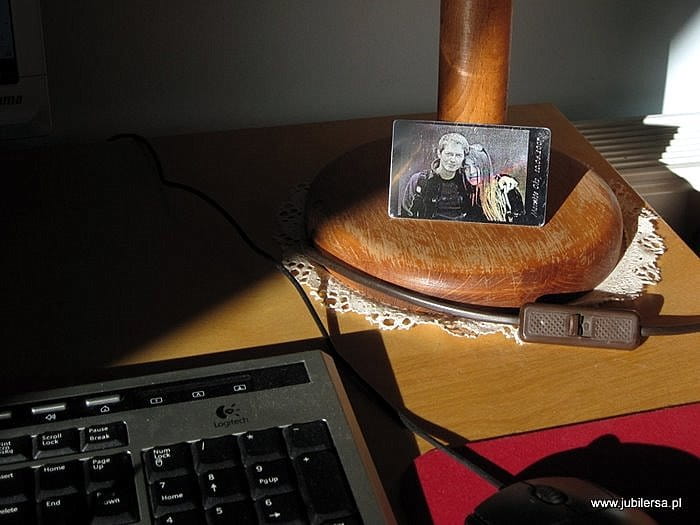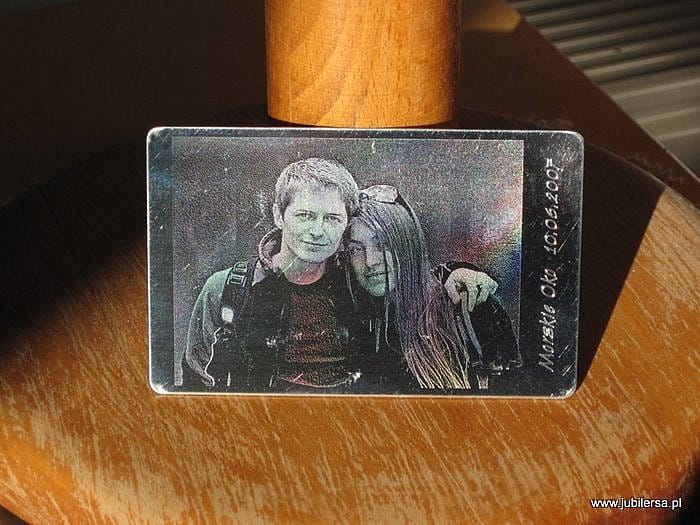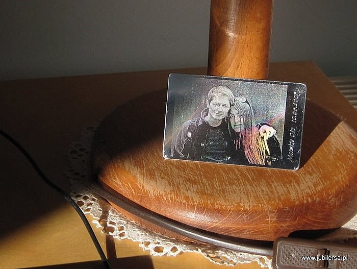 - Trwałość zdjęcia - praktycznie nie ma możliwości usunięcia wygrawerowanego obrazu. Na przykładowych zdjęciach widać kartę wygrawerowaną w 2007 roku, noszoną codziennie w portfelu. Pomimo rys na powierzchni metalu grawerunek nie stracił nic ze swojej wyrazistości.