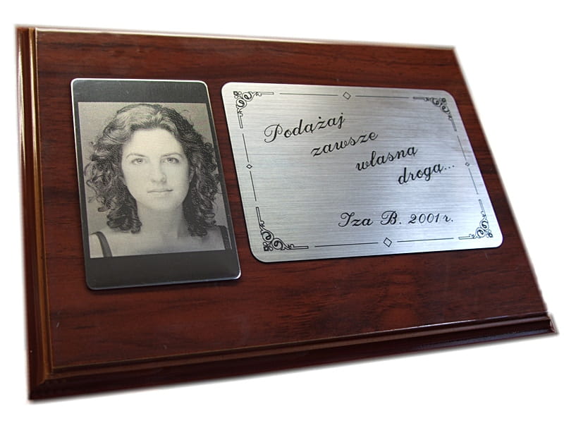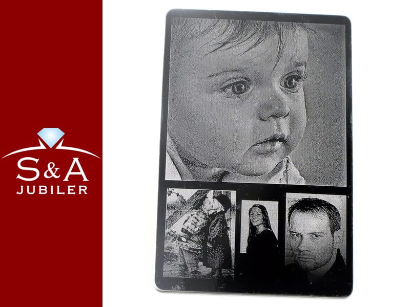 Dzięki nowoczesnym narzędziom w naszej pracowni grawerskiej, możemy uwiecznić dowolne Państwa zdjęcie, lub nawet kilka zdjęć na powierzchni stalowej karty o rozmiarze 84 x 55 mm. Taka stalowa tabliczka ma wymiary i kształt identyczny z wielkością każdej karty płatniczej lub dowodu osobistego, dzięki czemu idealnie mieści się w każdym portfelu z kieszonkami na karty bankomatowe. Grawerunek wykonany przy użyciu diamentu, nadaje niezwykłą wyrazistość i ostrość grawerowanego obrazu. Każdy fragment obrazu powstaje przez nakłucie powierzchni czubkiem diamentu co pozostawia jasny, błyszczący punkt. Tysiące takich punktów na powierzchni tworzące cały obraz, odbijają światło słoneczne i sprawiają, że całe zdjęcie lśni i nabiera życia. Dodatkowo, oprócz samego zdjęcia, możemy wygrawerować dowolną pamiątkową dedykację. Ilość tekstu jest tutaj praktycznie nieograniczona. W takiej dedykacji można zawrzeć datę, imiona, sentecję, cytat, symbol lub dowolną inną treść.