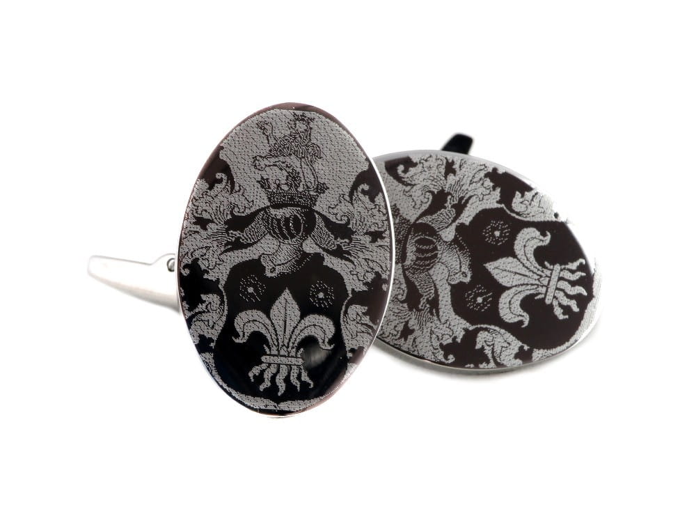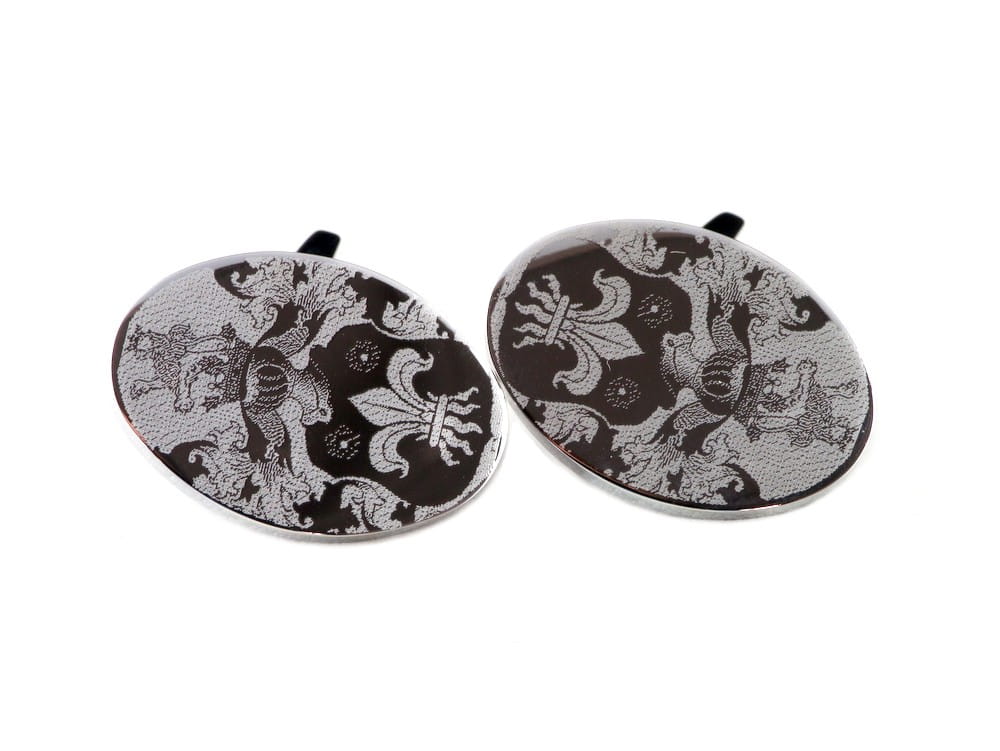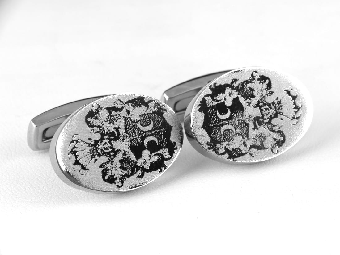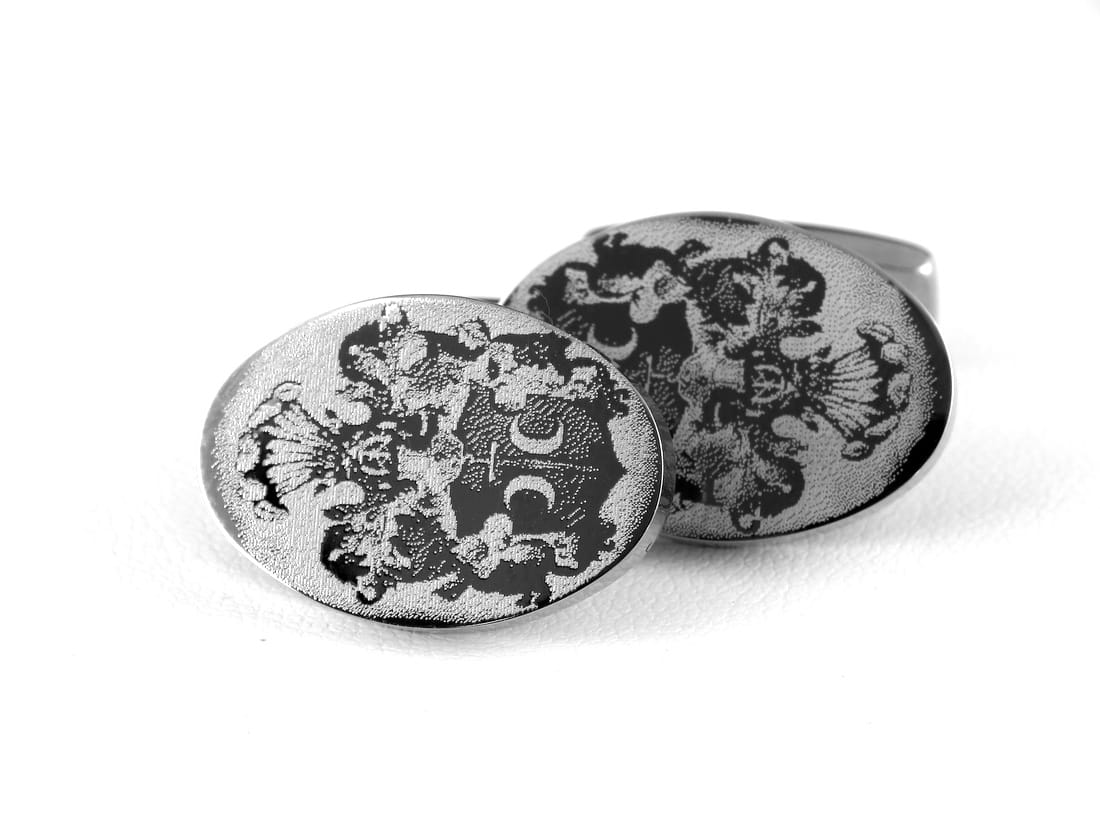 Stalowe spinki do mankietów z możliwością wykonania gawerunku. Są masywne, trwalsze od srebrnych a ich powierzchnia jest idealnie wypolerowana. Na gładkiej, lustrzanej powierzchni świetnie wygląda grawerunek zdjęcia, np. twarzy dzieci. Na tafli każdej ze spinek można umieścić dedykację lub dowolny symbol. Grawerunek wykonany będzie diamentem i będzie błyszczący. Wymiary owalnych części to 23 x 16 mm. Grawerunek tekstu można umieścić na owalnej tafli lub na ruchomym elemencie od spodu.