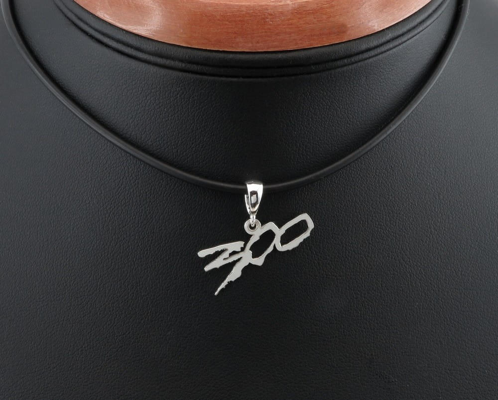 Na życzenie klienta wykonaliśmy zawieszkę inspirowaną oprawą graficzną filmu „Trzystu". Zainspirowani grafiką przygotowaliśmy projekt oraz zaplanowaliśmy pracę. Z grubszego srebrnego arkusza w próbie 925 wycięliśmy odpowiedni kształt, Grubość materiału w tym wypadku jest gwarantem sztywności całej ażurowej formy. Po zamontowaniu krawatki, wisior ręcznie wypolerowaliśmy na wysoki połysk. Cała zawieszka jest niewielka, ma raptem 25 × 15 mm.