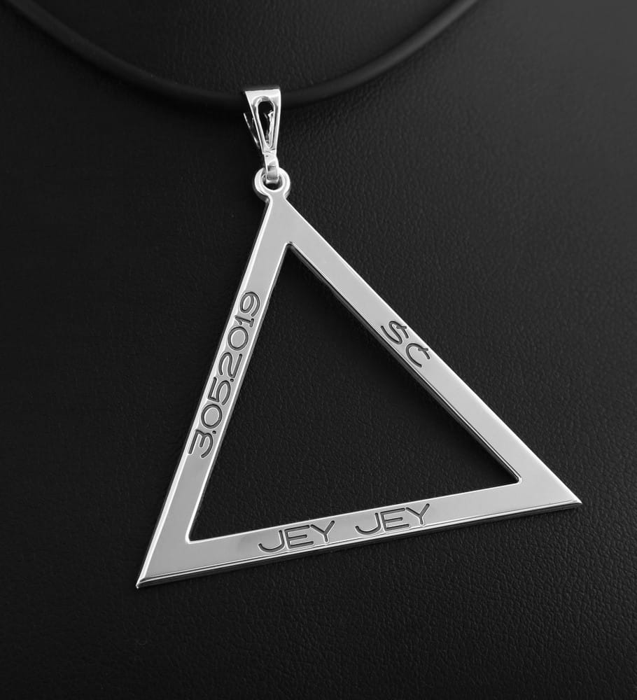 Duży wisior w kształcie równoramiennego trójkąta został wykonany ze srebra próby 925, na indywidualne zamówienie klientki. Gruby arkusz srebra zapewnia zawieszce sztywność oraz trwałość. Całość została wykończona na wysoki połysk, ażurowa krawatka nadaje formie stylu i lekkości. Cały przedmiot jest dość masywny, jednak będzie doskonałym uzupełnieniem klasycznej stylizacji. Przed wykonaniem wykonaliśmy dla klientki projekt do oceny.
