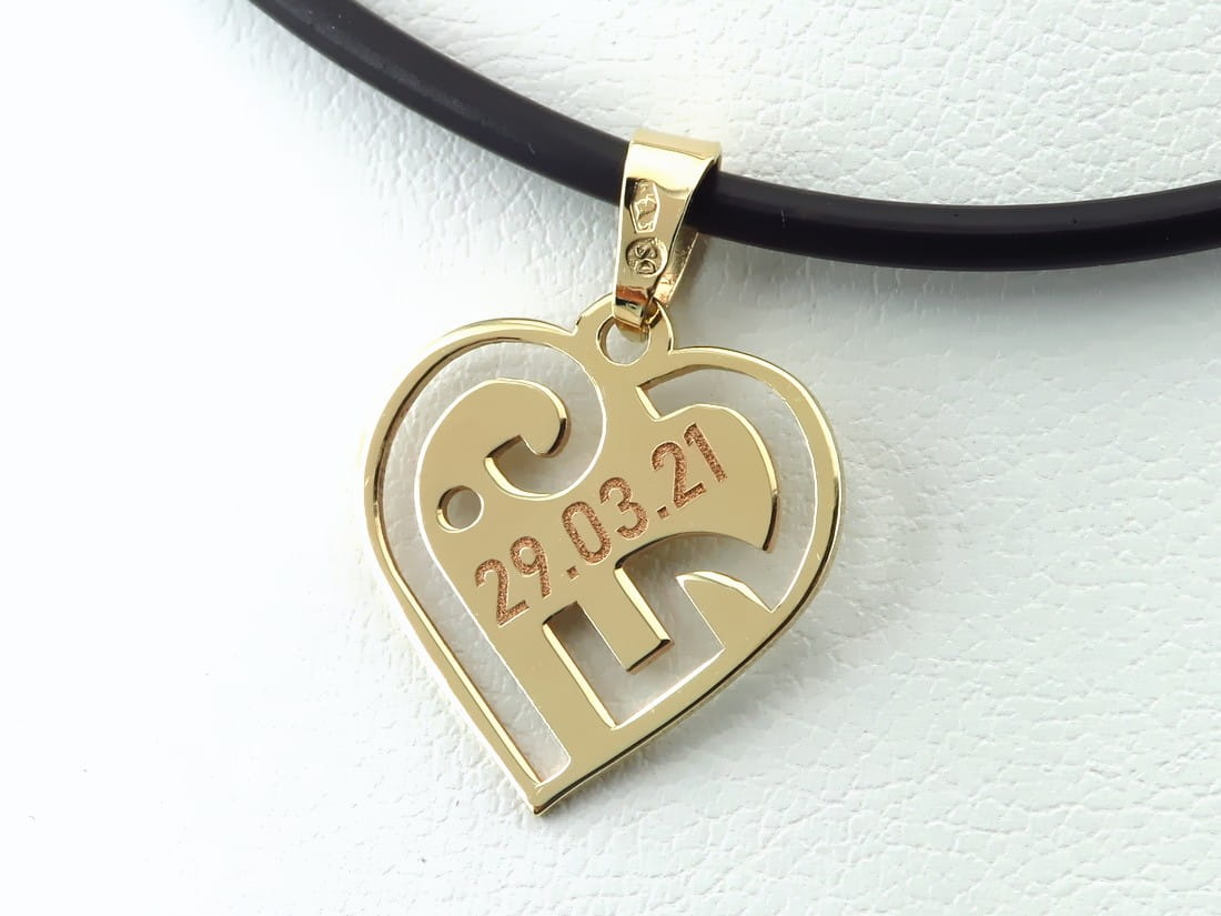 Kiedy nie potrafimy zdecydować, która opcja podoba nam się bardziej, zdarza nam się poszaleć. Na zamówienie wykonaliśmy ażurową zawieszkę w kształcie serca z ukrytym weń słoniem. Wisiorek został wykonany ze złotego materiału w próbie 585. Zawieszka została najpierw zaprojektowana zgodnie z sugestiami pomysłodawcy, wycięta, wypolerowana na wysoki połysk a tył opatrzony okolicznościowym grawerunkiem. Jeśli mają państwo pomysł na spersonalizowaną biżuterię, zapraszamy do kontaktu.