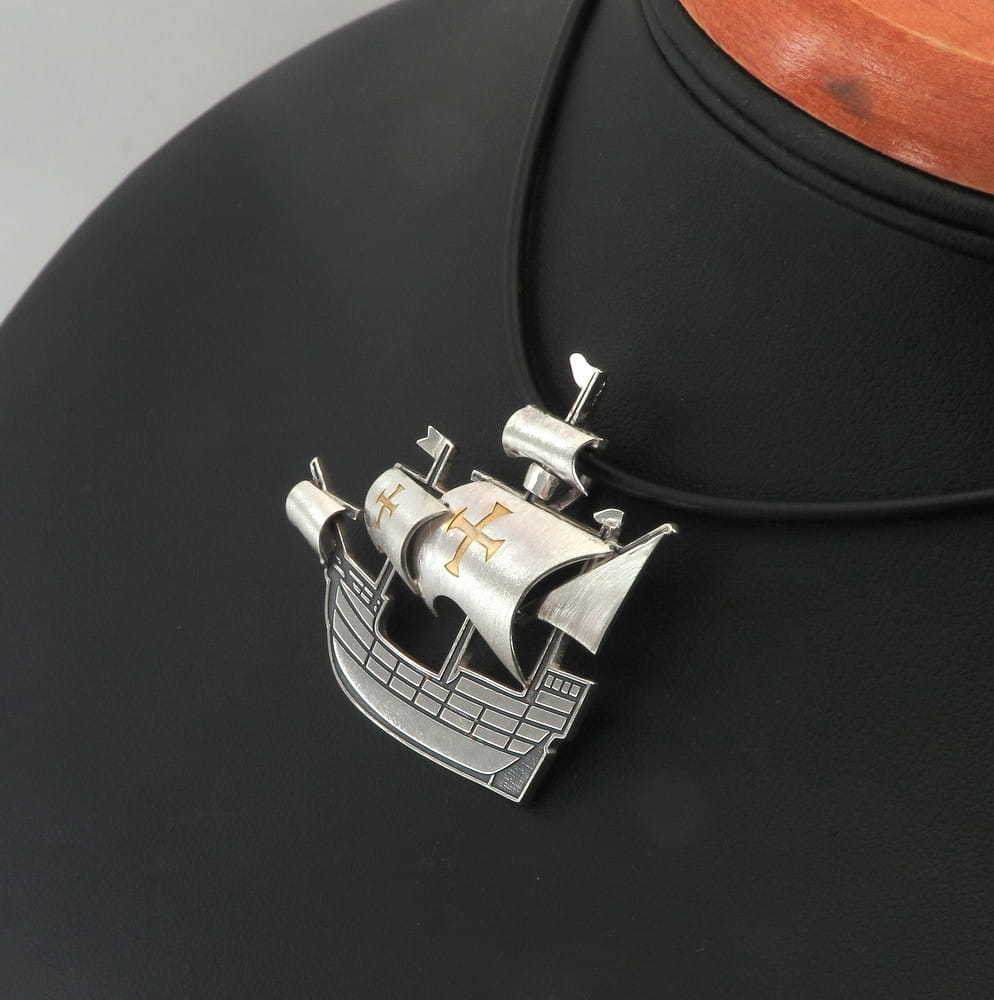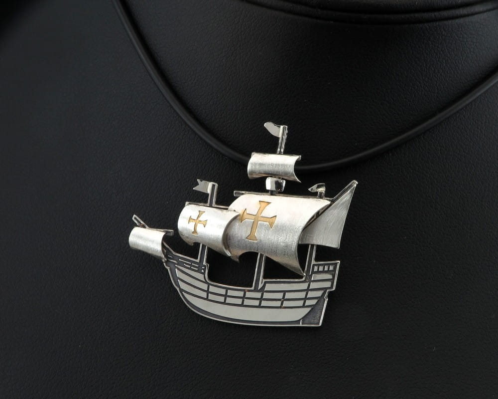 O zawieszkę w formie statu Santa Maria poprosiła nas klientka. Szukała podobnego wzoru w internecie ale nie udało się znaleźć gotowego wyroby. Klientka przesłała do nas zdjęcie i jaki statek konkretnie jej chodzi i na tej podstawie przygotowaliśmy projekt do oceny. Cała forma miała być lekko wypukła, głównie chodziło o żagle, które miały wyglądać na wypukłe. Z taką też myślą zaczęliśmy projekt. Każdy element został wycięty osobno i zmonotowany ręcznie. Najpier grawerowany kadłub i maszty a następnie poszególne żagle i flagi. Na koniec postanowiliśmy pozłocić krzyże na żaglach. Aby wyeksponować statek postanwiliśmy przelotki na naszyjnik schować z tyłu, bez tradycyjnej krawatki z kółeczkiem doczepianej na czubku. W ten sposób ciemny naszyjnik ładnie komponuje się z ubraniem i można skupić oko na samym statku. Klientka postanowiła odebrać gotową zawieszkę osobiście. Efekt końcowy zrobił niesamowite wrażenie.