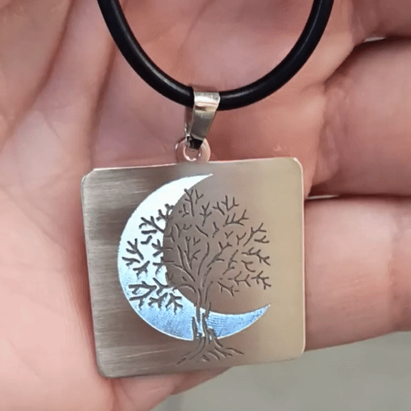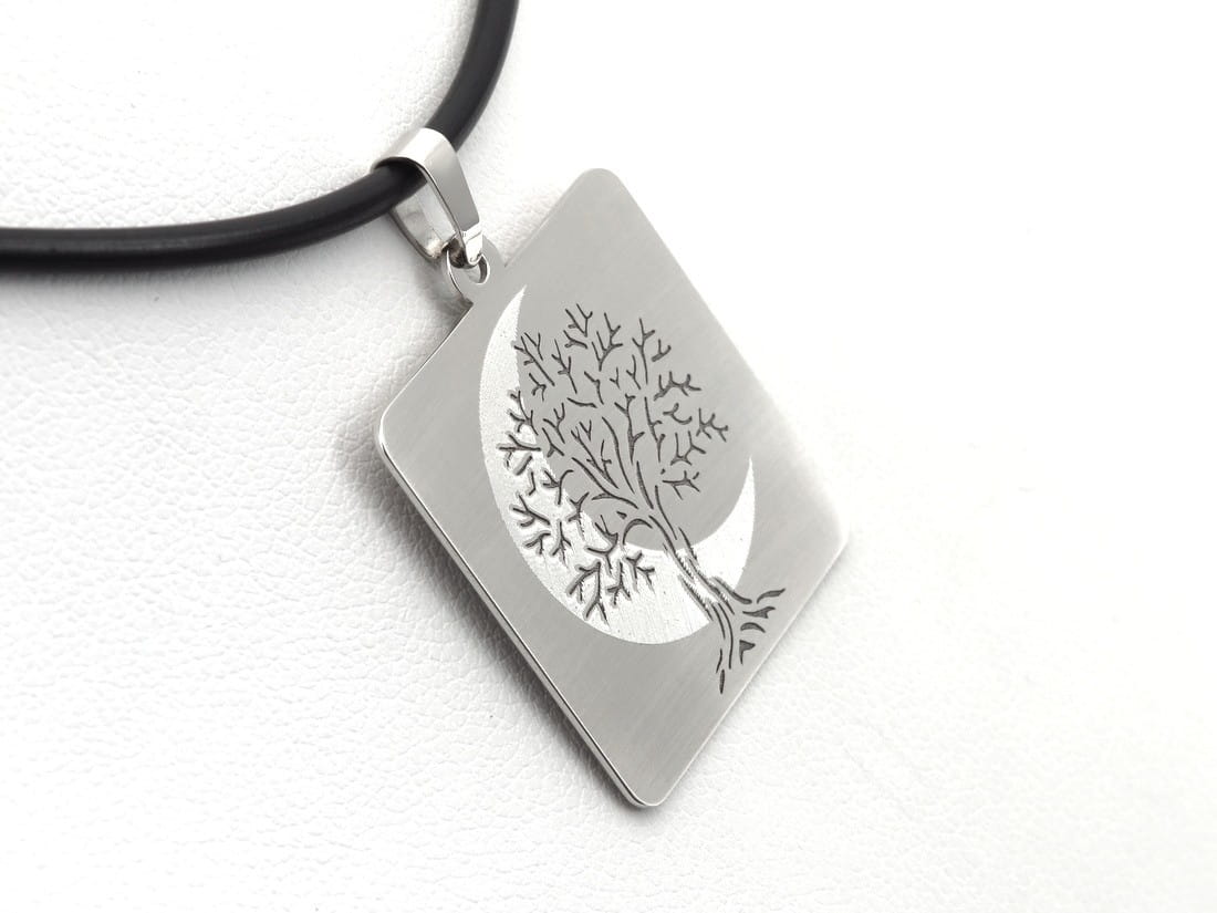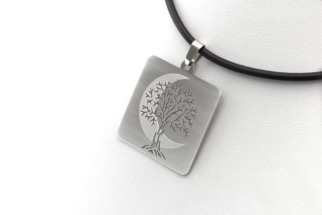 Na życzenie klienta wykonaliśmy zawieszkę z białego złota z symbolem drzewa. Po ustaleniu z pomysłodawcą szczegółów dotyczących wielkości oraz charakteru samego wisioru przystąpiliśmy do pracy. Z grubszego arkusza białego złota w próbie 585 przygotowaliśmy blaszkę o wymiarach 25 × 28 mm. Została ona wypolerowana, emblemat drzewa został wygrawerowany laserowo i za oksydowany, natomiast księżyc w tle został wygrawerowany diamentem, co daje fantastyczny efekt lustrzanego połysku. Front dla kontrastu został pociągnięty satyną a plecy i krawędzie wypolerowane. Łączenie technik grawerowania pozwoliła nam uzyskać niebanalny efekt i różnorodność struktur w tym projekcie. Jeśli mają Państwo pomysł na spersonalizowaną biżuterię, zapraszamy do kontaktu.