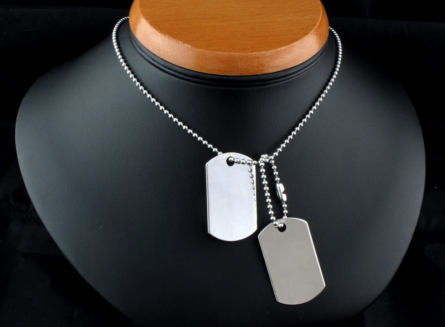 Zestaw dwóch nieśmiertelników o łacznej masie 20g. Łańcuch kuleczkowy długości 50cm. Wymiary blaszek to 37 mm / 22 mm. Jedna z blaszek dopinana na osobnym łańcuchu, tak jaka w wojskowym modelu. Obie zawieszki nadają się pod grawerunek dedykacji lub zdjęcia. Całość wykonana jest ze srebra pr. 925.