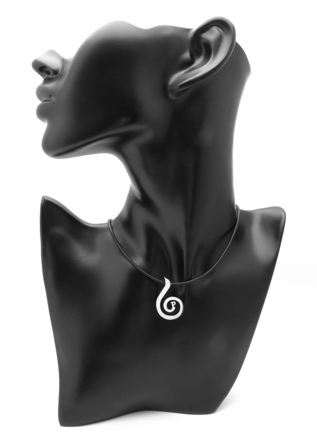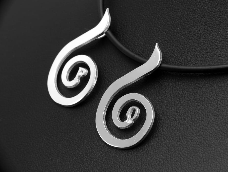 Na życzenie klienta wykonaliśmy komplet srebrnych zawieszek ślimaków z literkami na końcu. Ten niecodzienny pomysł został zrealizowany zgodnie z wytycznymi klienta. Z grubszego arkusza srebrnej blachy o próbie 925 wycięliśmy dwa wisiorki, w odpowiednim kształcie i wielkości 19 × 32 mm. Wykonaliśmy z tyłu solidne mocowanie, aby nie psuć kompozycji zawieszki. Gotowy produkt został wypolerowany na wysoki połysk.